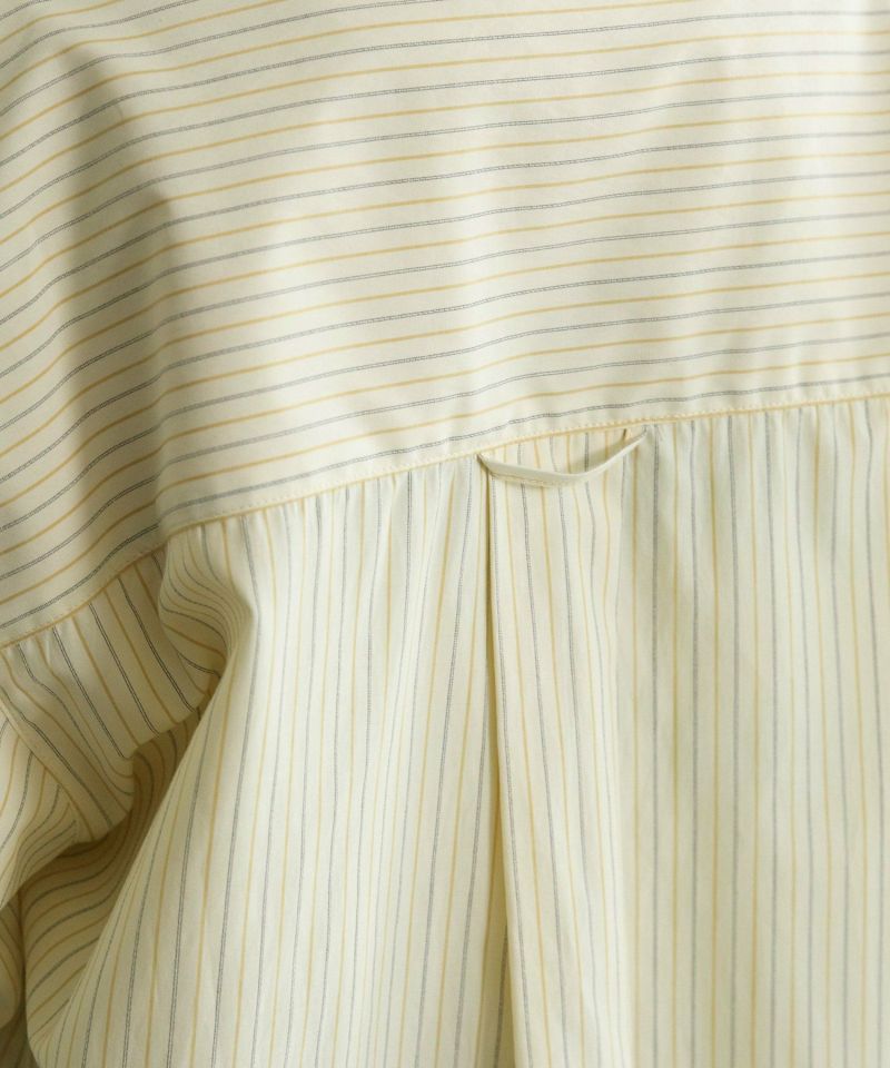 ポケットにたくさんついたリボンデザインが遊び心あるシャツ。かっちりしたストライプシャツを、ゆるっとしたサイズ感で今っぽくアレンジしました。甘さときちんと感をバランスよく楽しめる万能シャツです。フルオープンで羽織としての着用もこなれた印象になり、おすすめです。