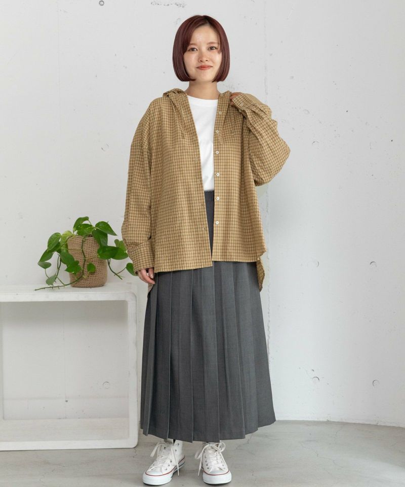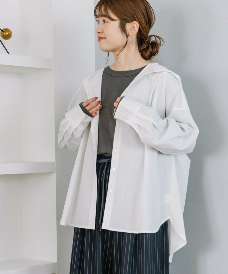 カジュアルな印象のフーディシャツ。羽織やすいゆったりとしたシルエットで、こなれた雰囲気を演出します。着回しがしやすいベーシックなオフホワイト・ブラックと、ユーズドアイテムのような雰囲気のあるチェックの3色展開です。