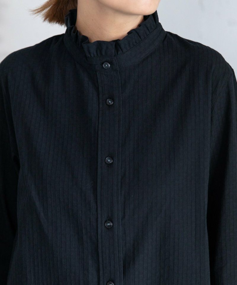 スタンドカラーにフリルをあしらったブラウス。フリル端を断ち切り仕様にする事でラフに仕上げました。身頃はスッキリとしたデザインにし、スタイリングに取り入れやすい、程良い甘さのブラウスに仕上げました。ニットやスウェットのインナーにしてもポイントになります。オフホワイトとブラックはストライプ状のドビー柄が入ったコットン素材、フラワーはネイビーベースに赤の花柄が効いたプリント柄です。