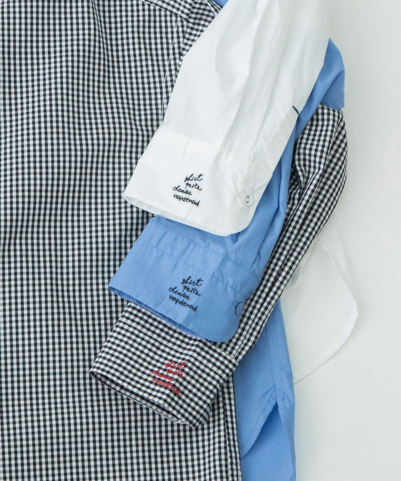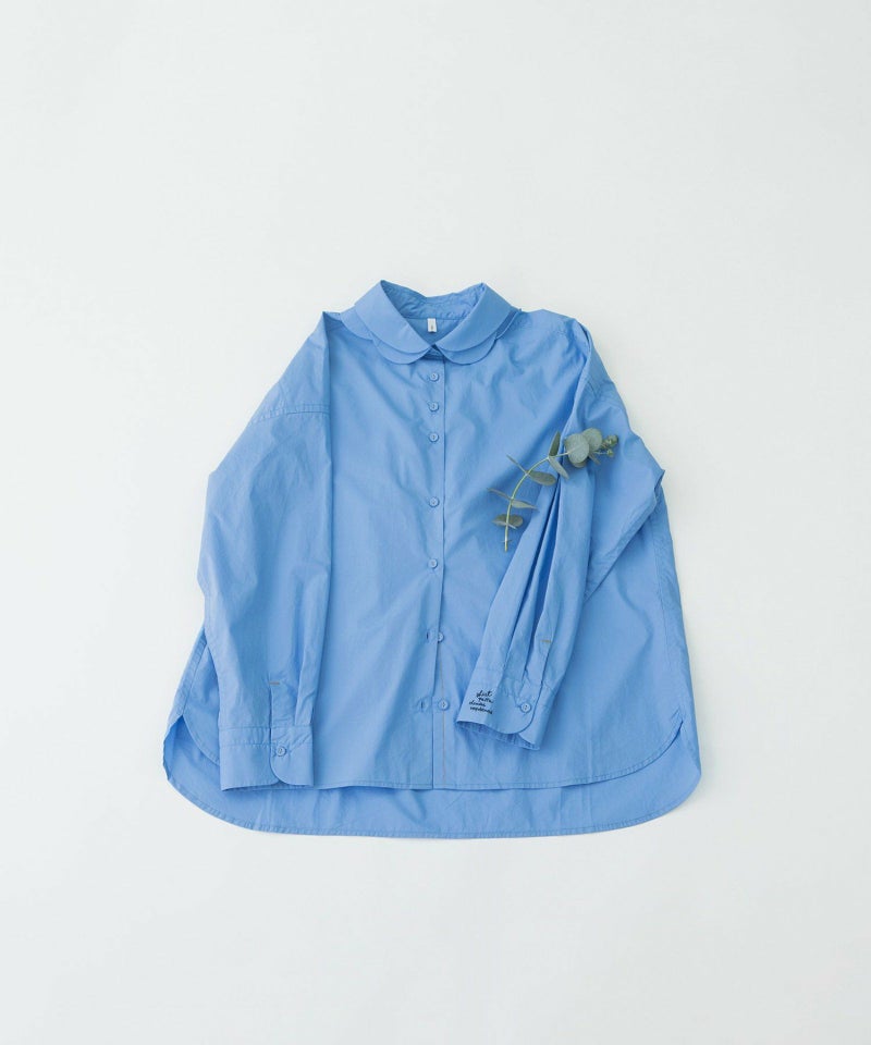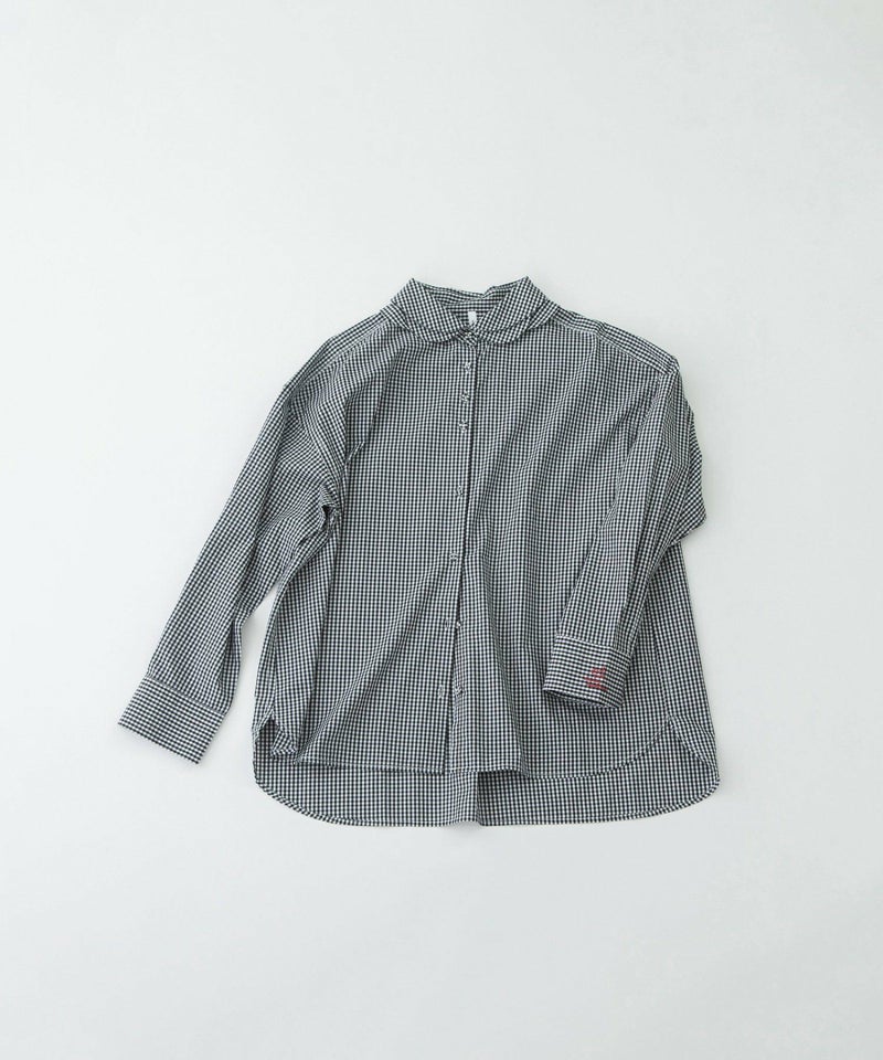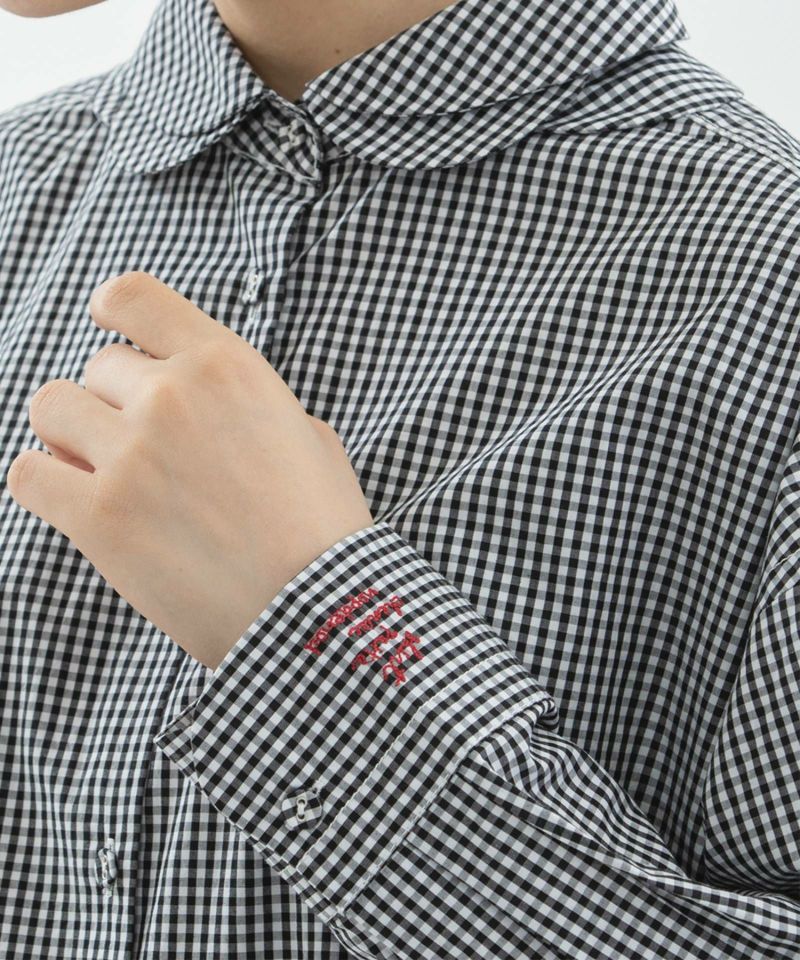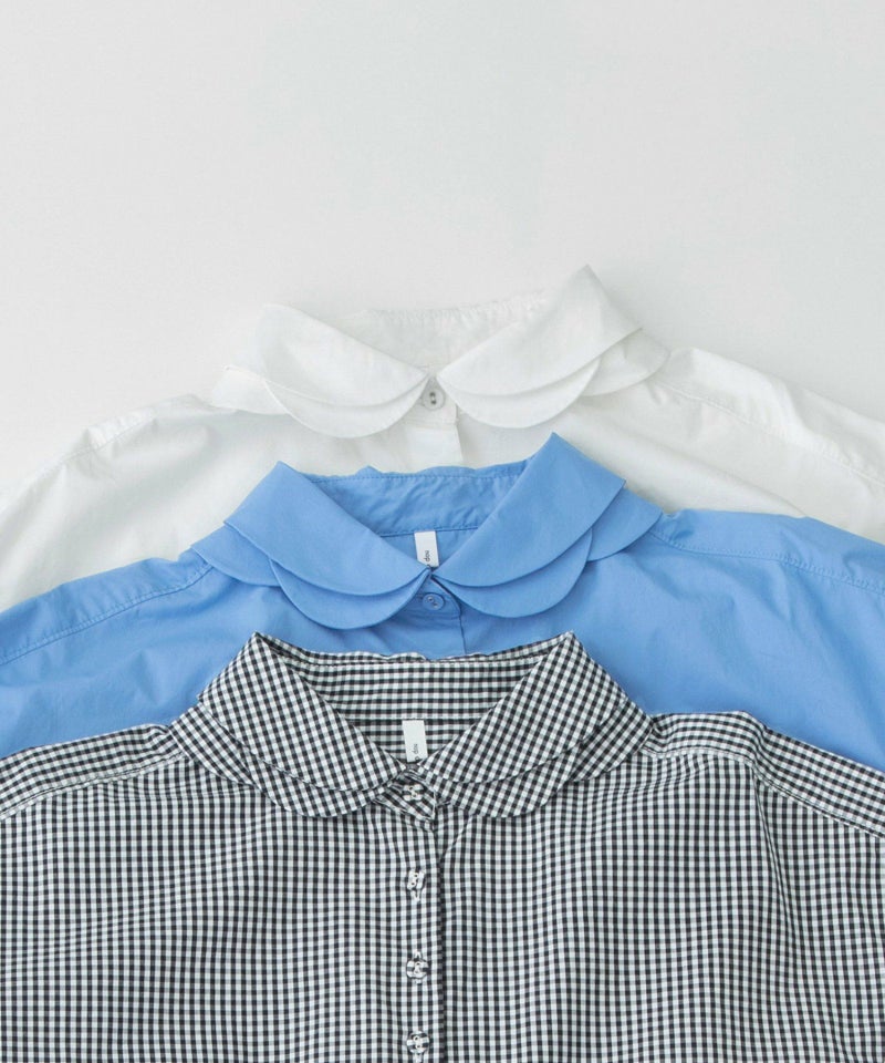 花びらが重なるようなデザインをシャツカラーに落とし込んだ、かっこよさと可愛らしさを併せ持つ衿が主役のシャツ。ボディはベーシックなシャツシルエット。素材は、ほどよくハリのあるタイプライターと、レトロでノスタルジックな雰囲気のギンガムの2タイプです。上部のボタン間隔をあえて狭くすることで、デザインのアクセントになるだけでなく、開け方の調整がしやすい仕様にしています。開けた時にちらりと見える配色ステッチもさりげないポイント。後ろが長めの前後差で、左カフスに""シャツ""を英語フィンランド語仏語で表したロゴ刺繍を入れています。
