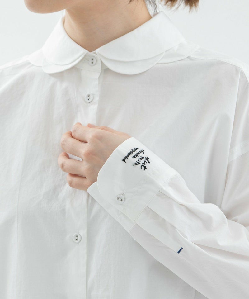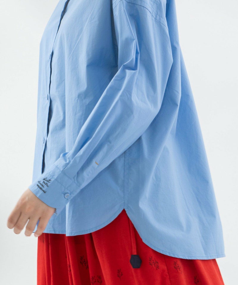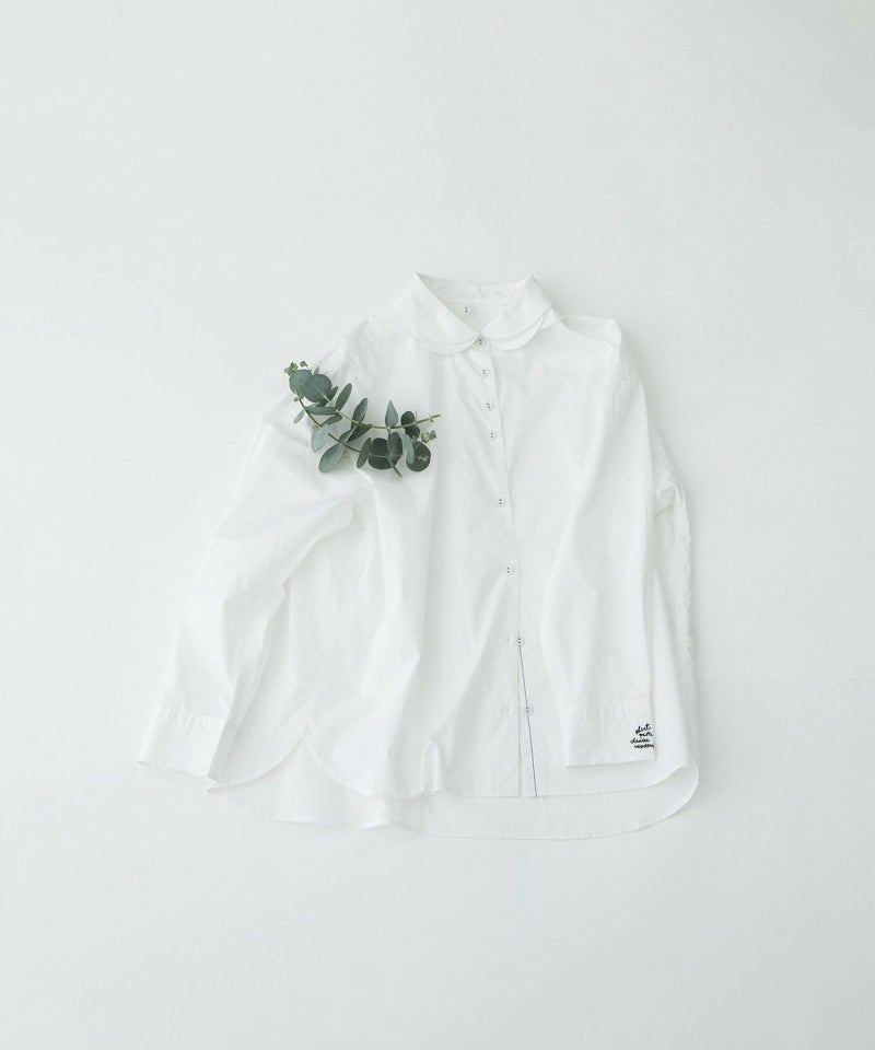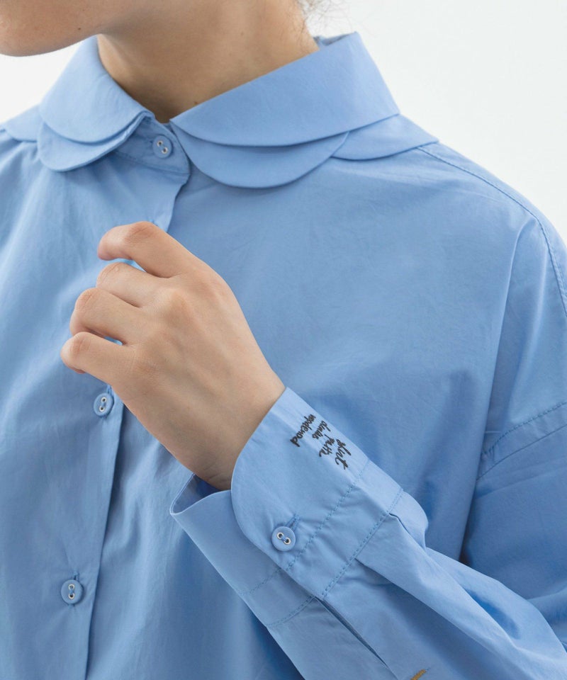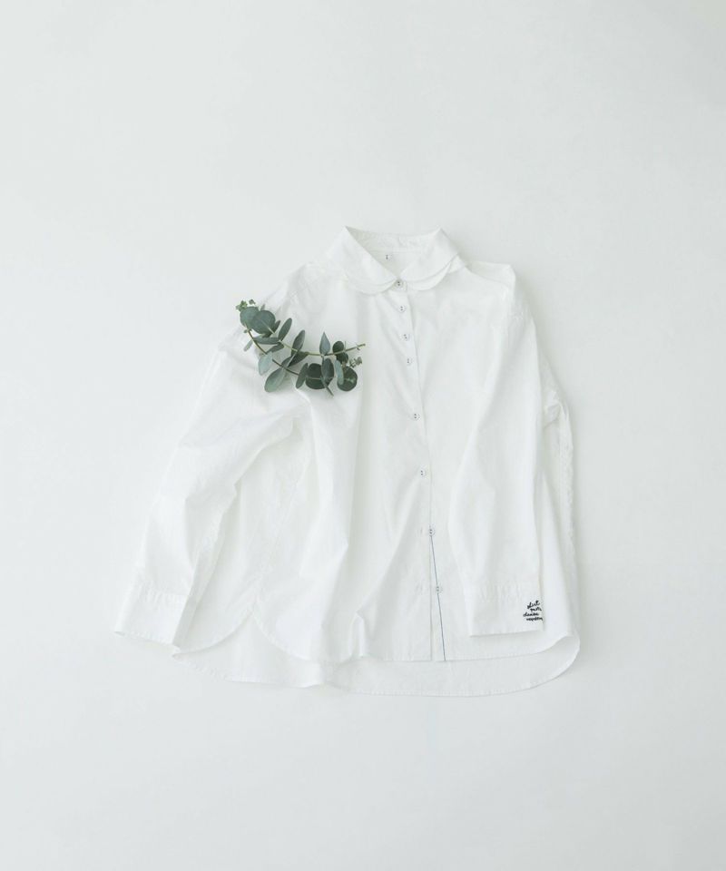 花びらが重なるようなデザインをシャツカラーに落とし込んだ、かっこよさと可愛らしさを併せ持つ衿が主役のシャツ。ボディはベーシックなシャツシルエット。素材は、ほどよくハリのあるタイプライターと、レトロでノスタルジックな雰囲気のギンガムの2タイプです。上部のボタン間隔をあえて狭くすることで、デザインのアクセントになるだけでなく、開け方の調整がしやすい仕様にしています。開けた時にちらりと見える配色ステッチもさりげないポイント。後ろが長めの前後差で、左カフスに""シャツ""を英語フィンランド語仏語で表したロゴ刺繍を入れています。