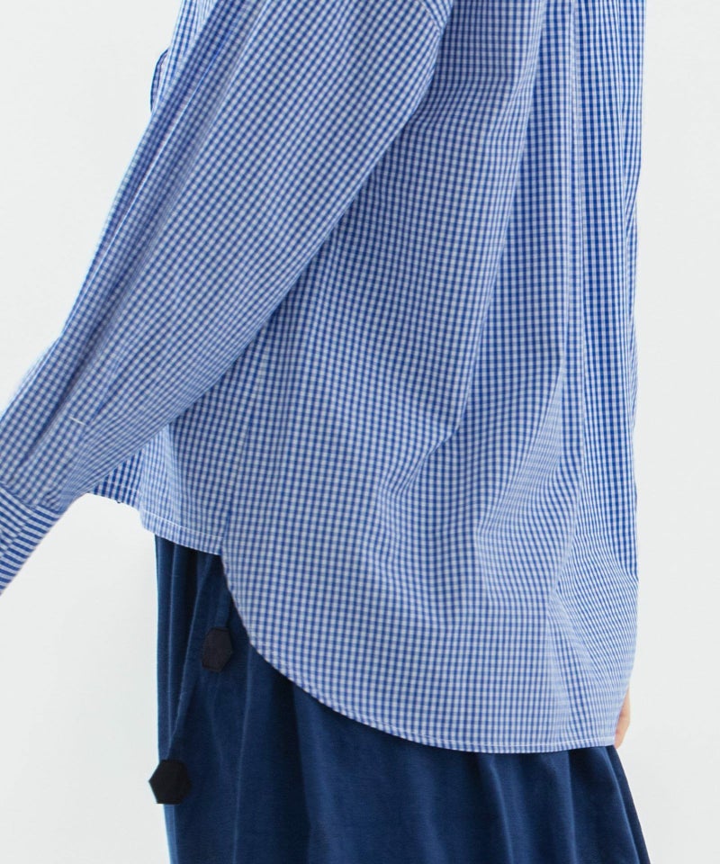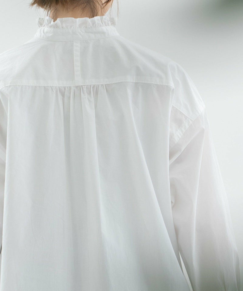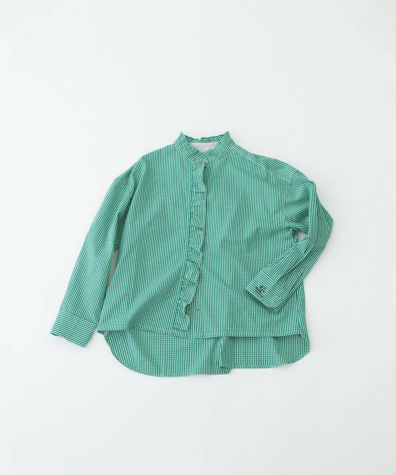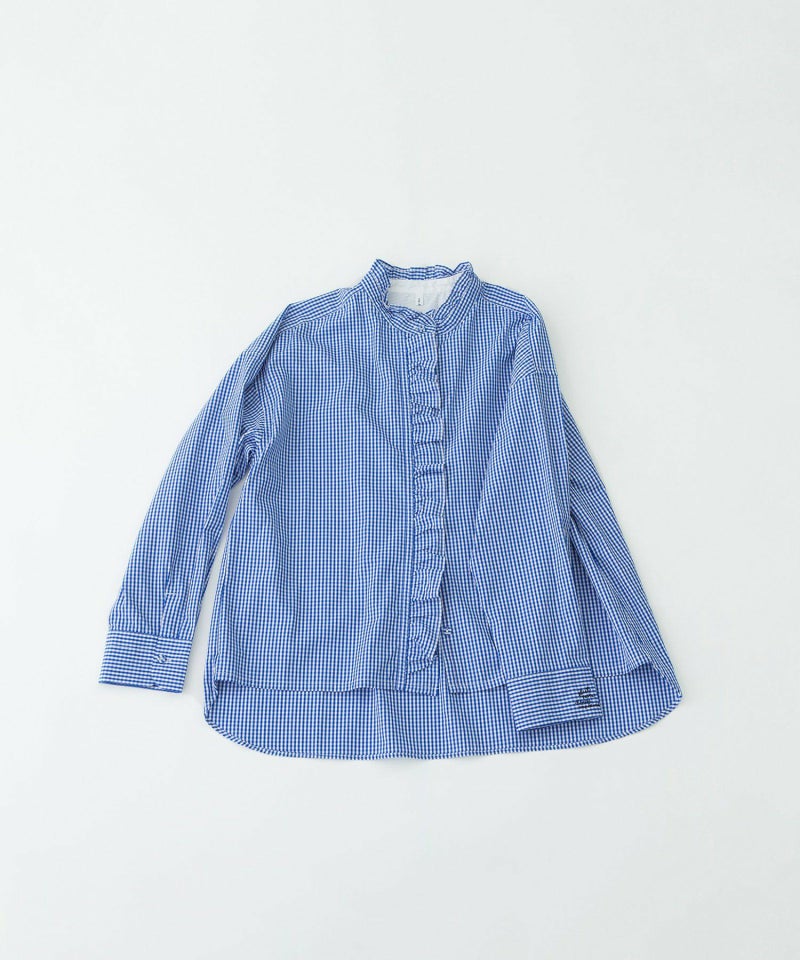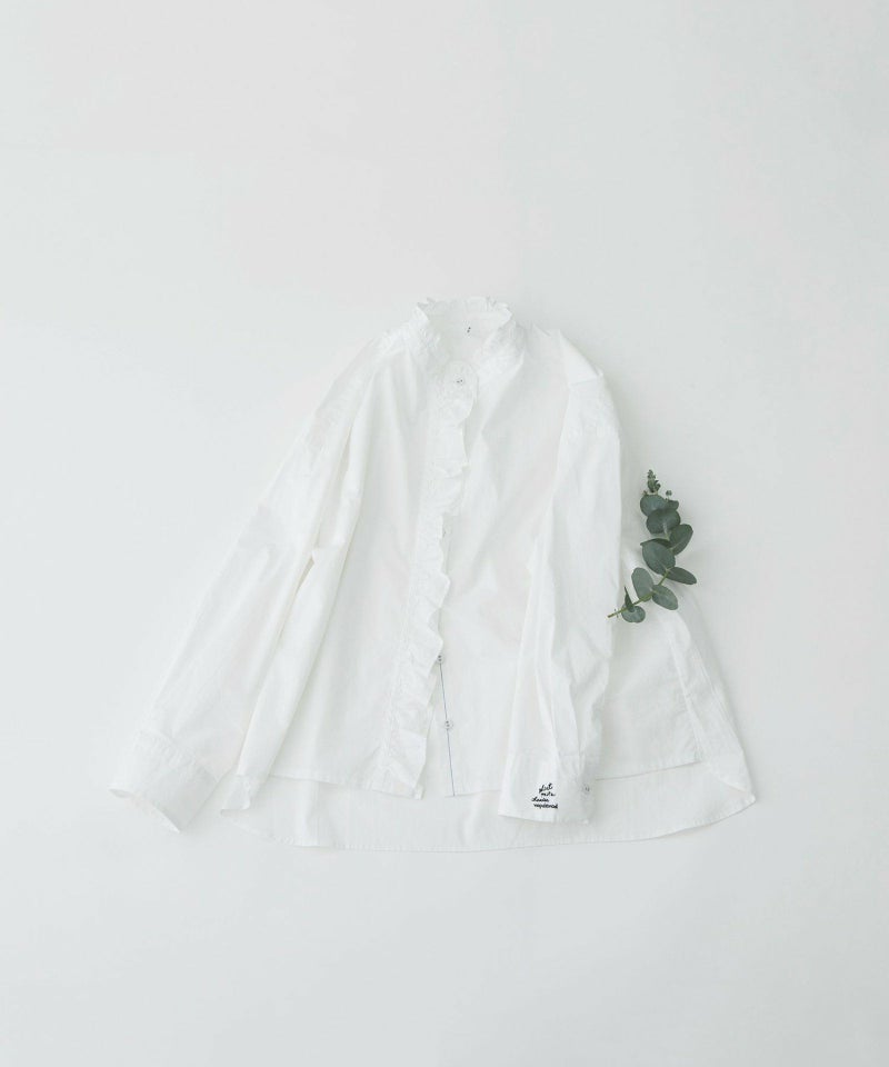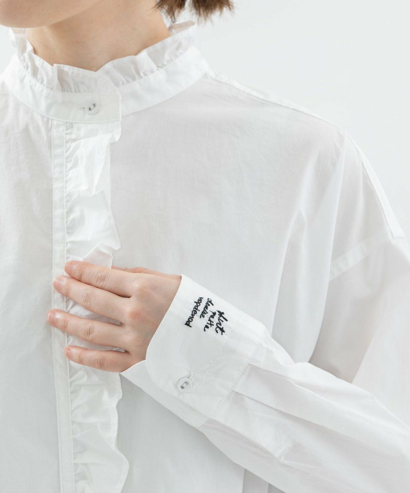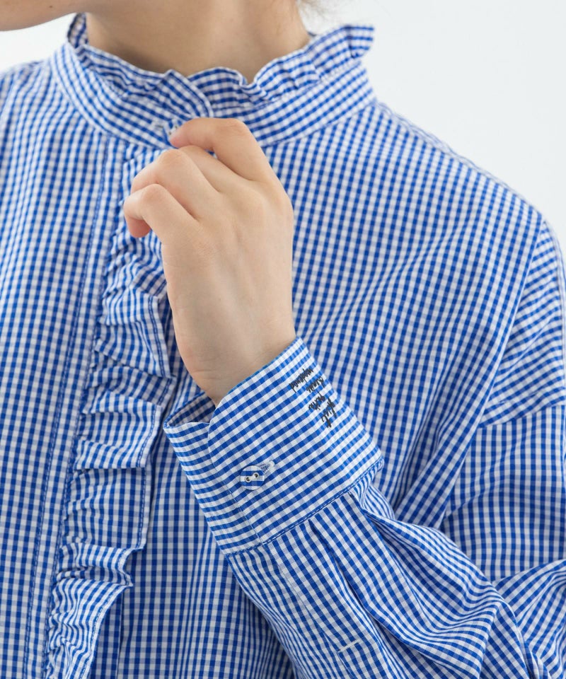 首に沿うスタンドネックのフリルと、フロントボタンの隠れるフリルが上品な甘さのあるシャツ。ボディはベーシックなシャツシルエット。すっきり着られるように前はストレートヘムで短めに、後ろ裾はラウンドしたデザインになっています。素材は、ほどよくハリのあるタイプライターと、レトロでノスタルジックな雰囲気のギンガムの2タイプです。開けた時にちらりと見える配色ステッチもさりげないポイント。左カフスに""シャツ""を英語フィンランド語仏語で表したロゴ刺繍を入れています。