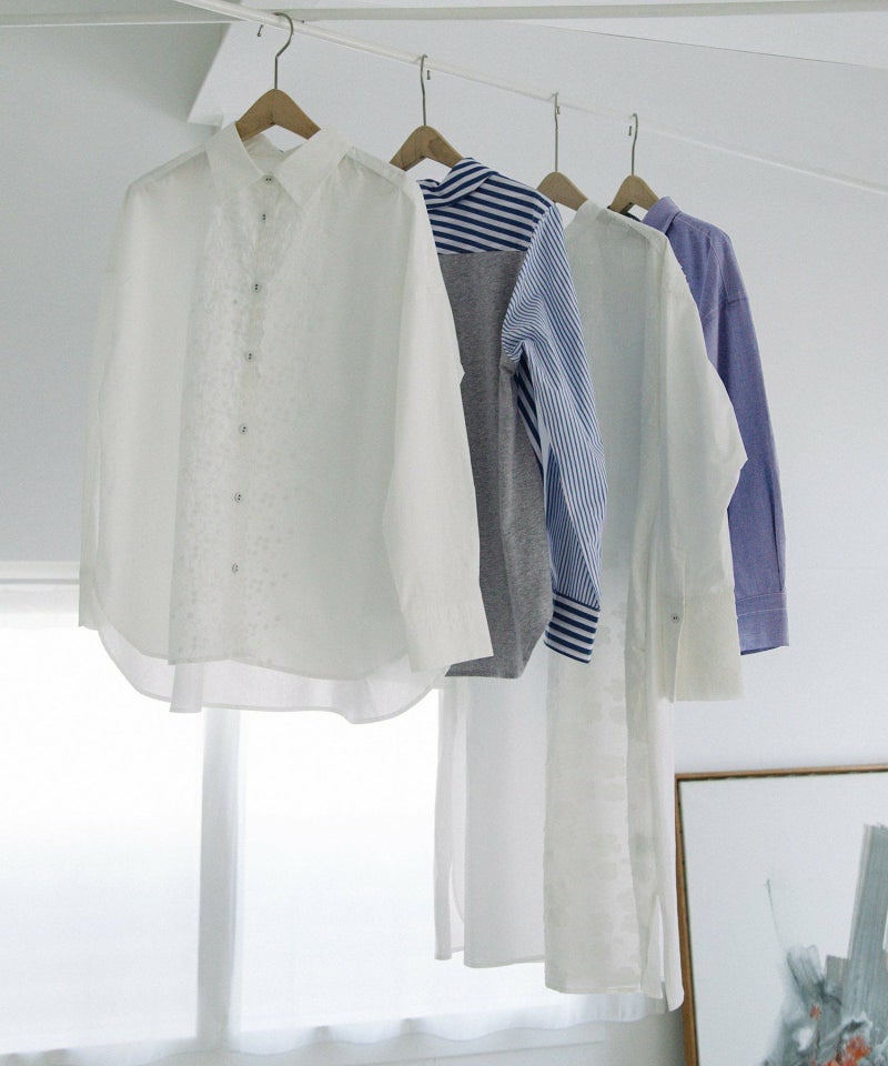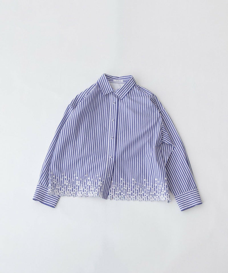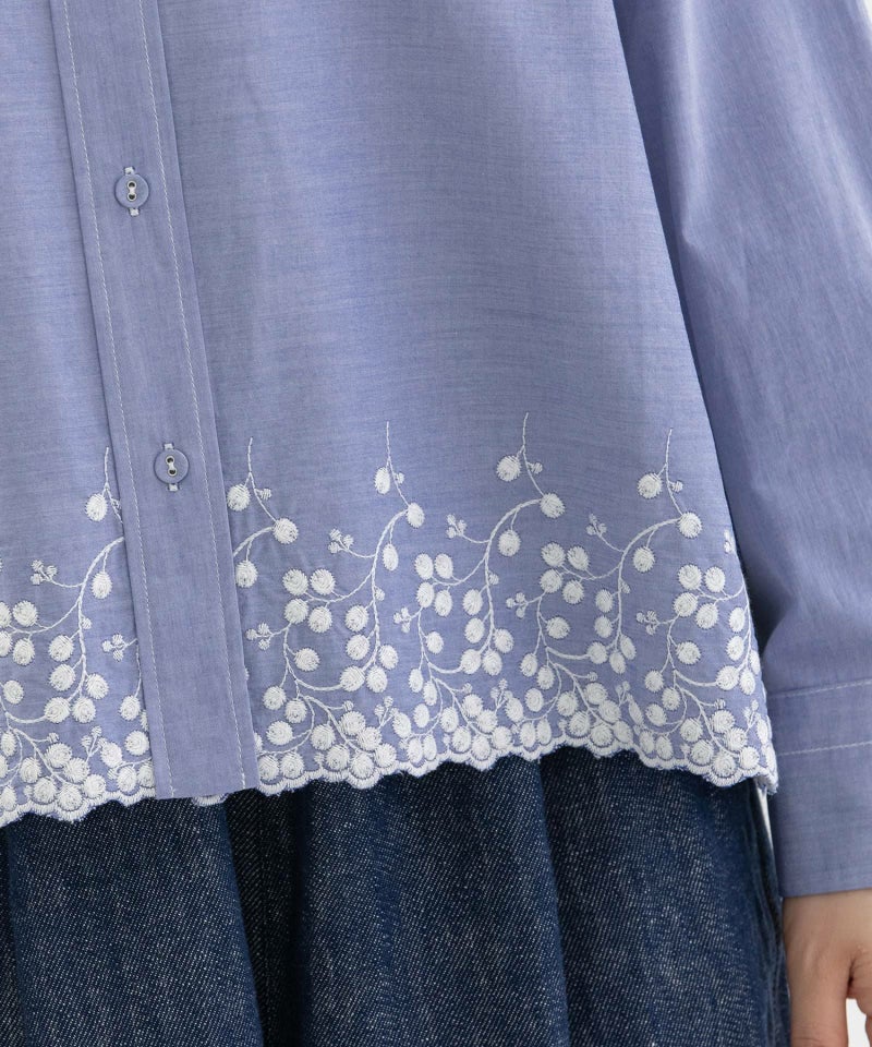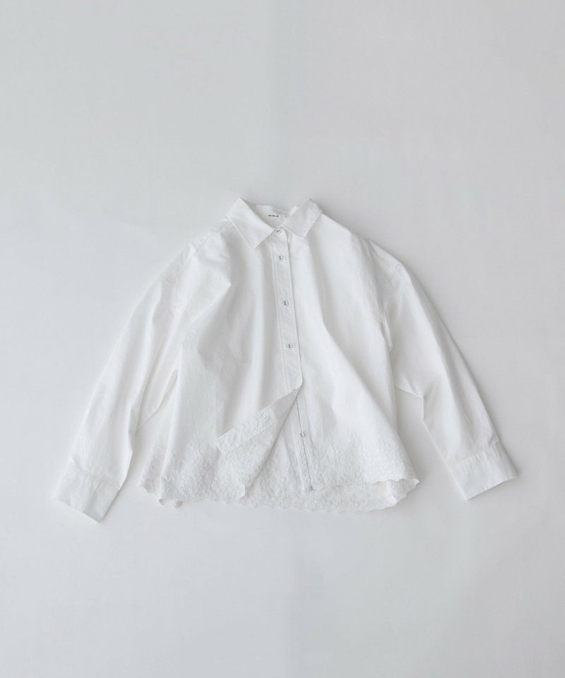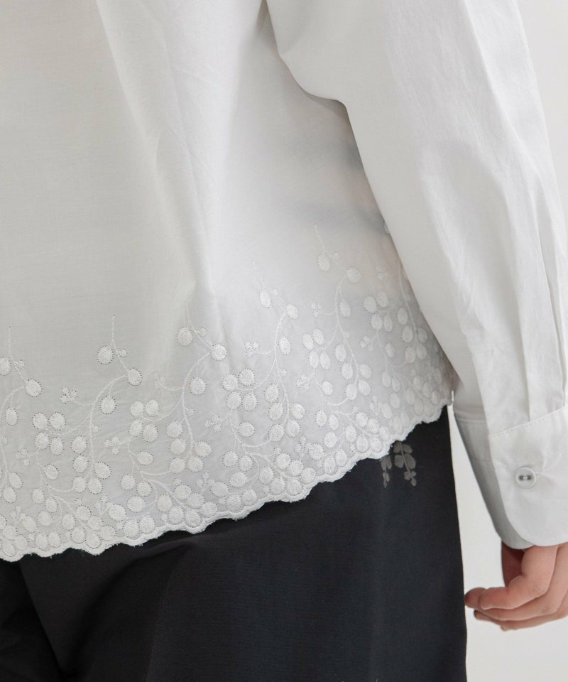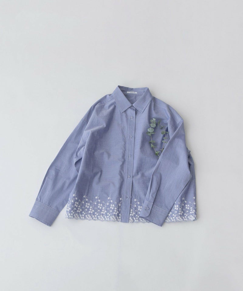 裾にスカラップ刺繍をいれたシンプルなシャツ。生地の片端にスカラップ刺繍を施した、オリジナル生地で仕立てました。オフホワイト、シャンブレー、ストライプの3色展開で、いずれもオフの刺繍をあしらっています。刺繍は穴のあいていない、小さなバラのようなモチーフが特徴。共くるみボタンや、開けた時にちらりと見える配色ステッチもポイントにしています。