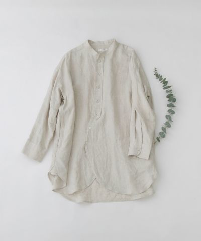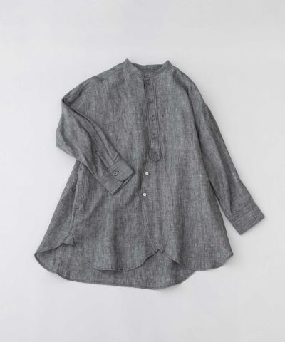 リネンシャンブレーのバンドカラーチュニックシャツ