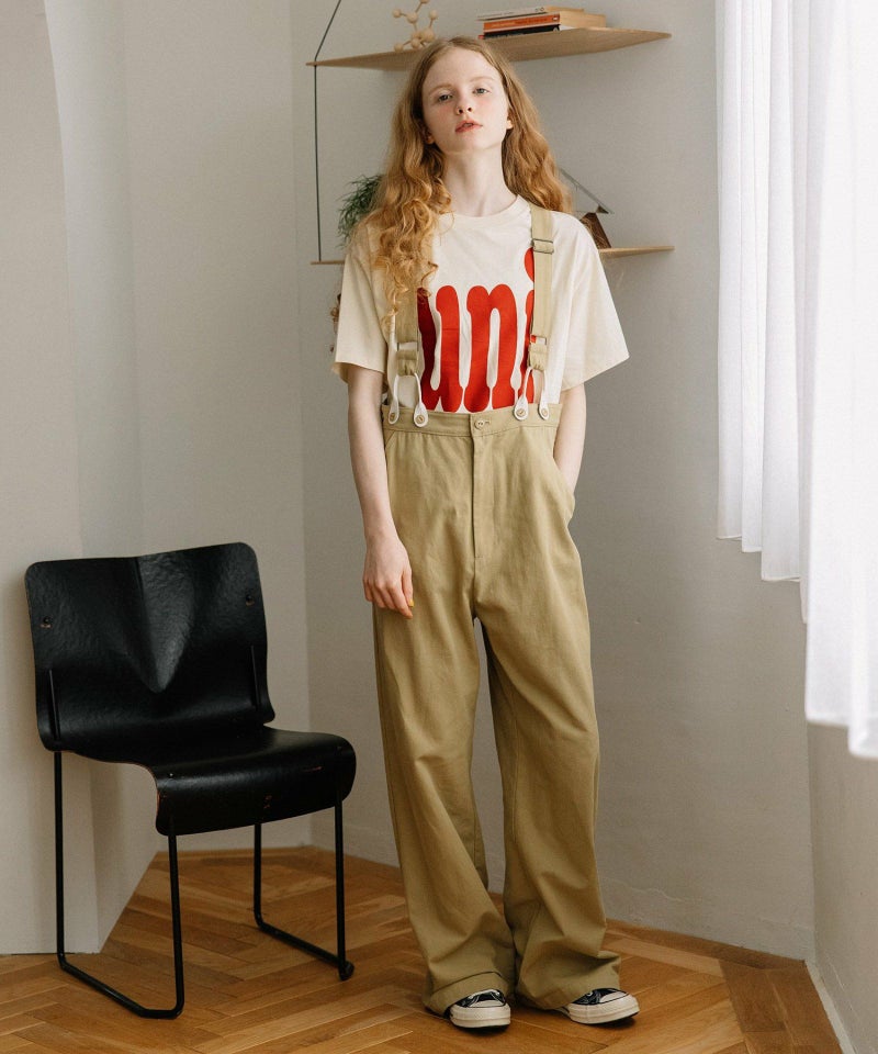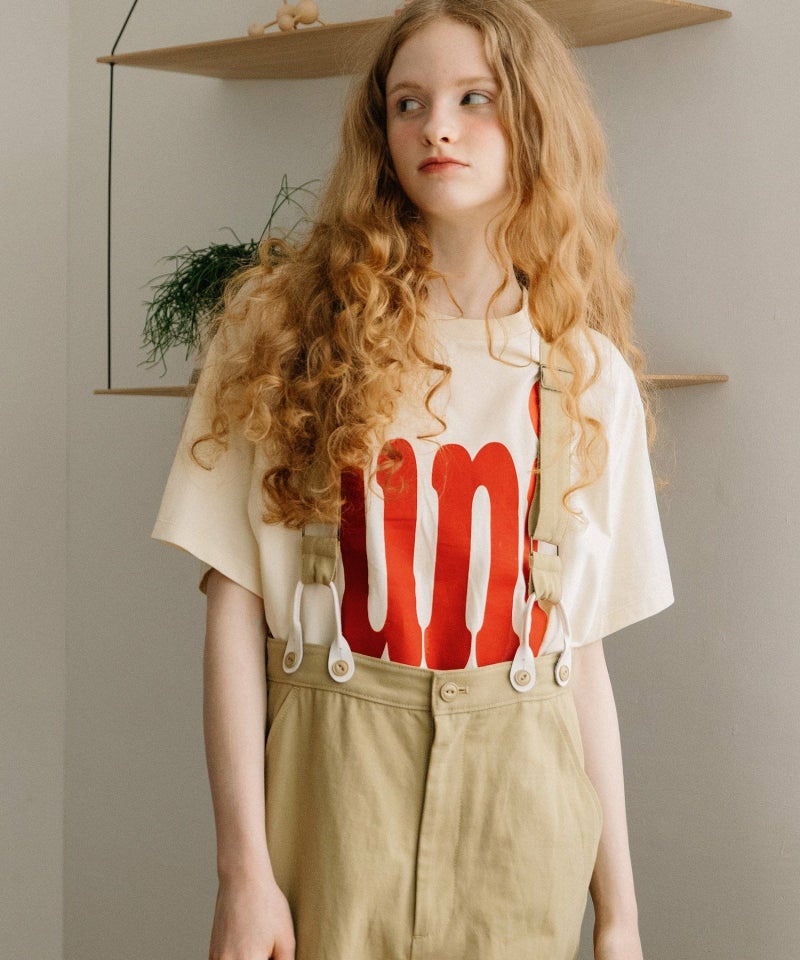 縦にロゴを伸ばした大胆なプリントがキャッチーなTシャツ。丸みのあるフォントであまり文字に見えないところもポイント。長すぎない着丈ですっきりと着られ、カジュアルなパンツ合わせもボリューム感のあるスカート合わせもおすすめです。