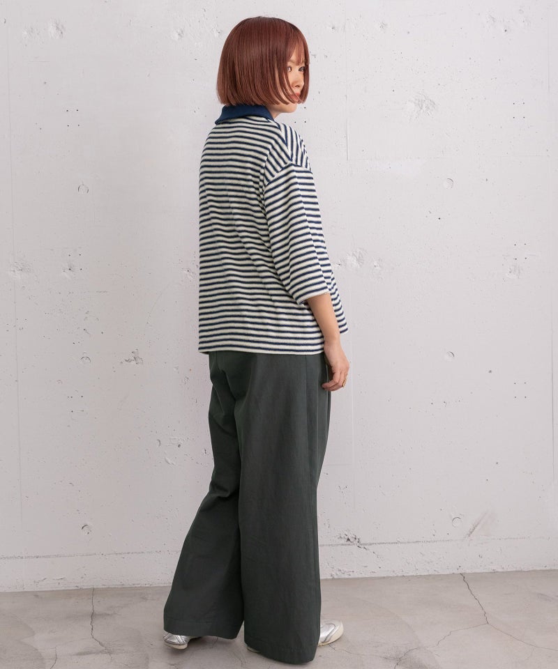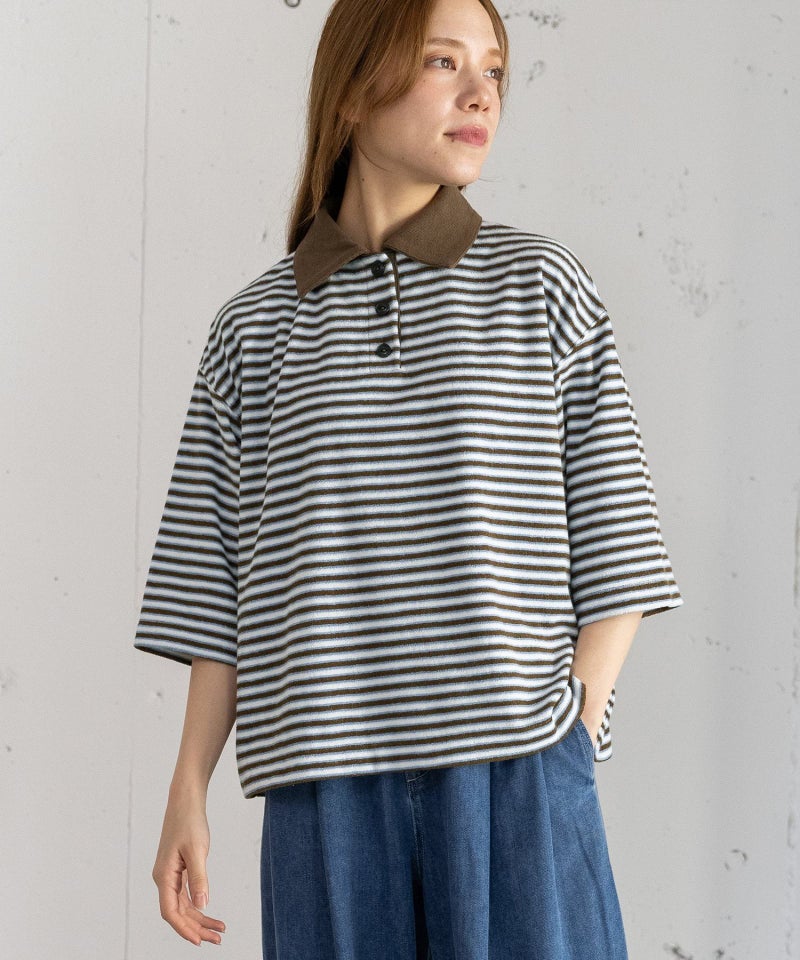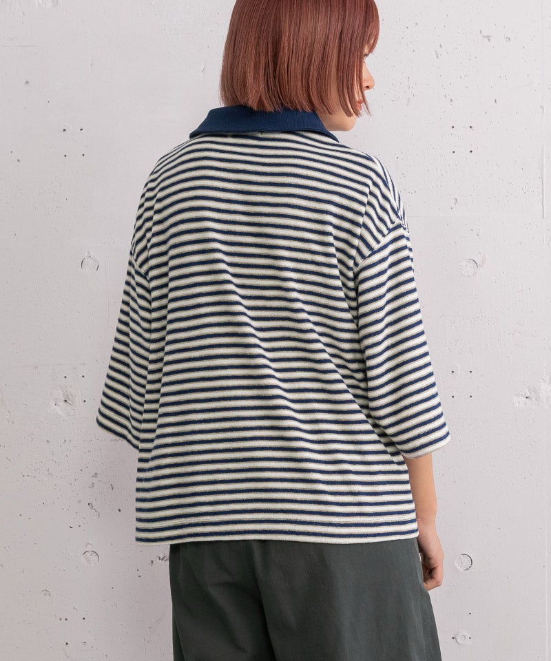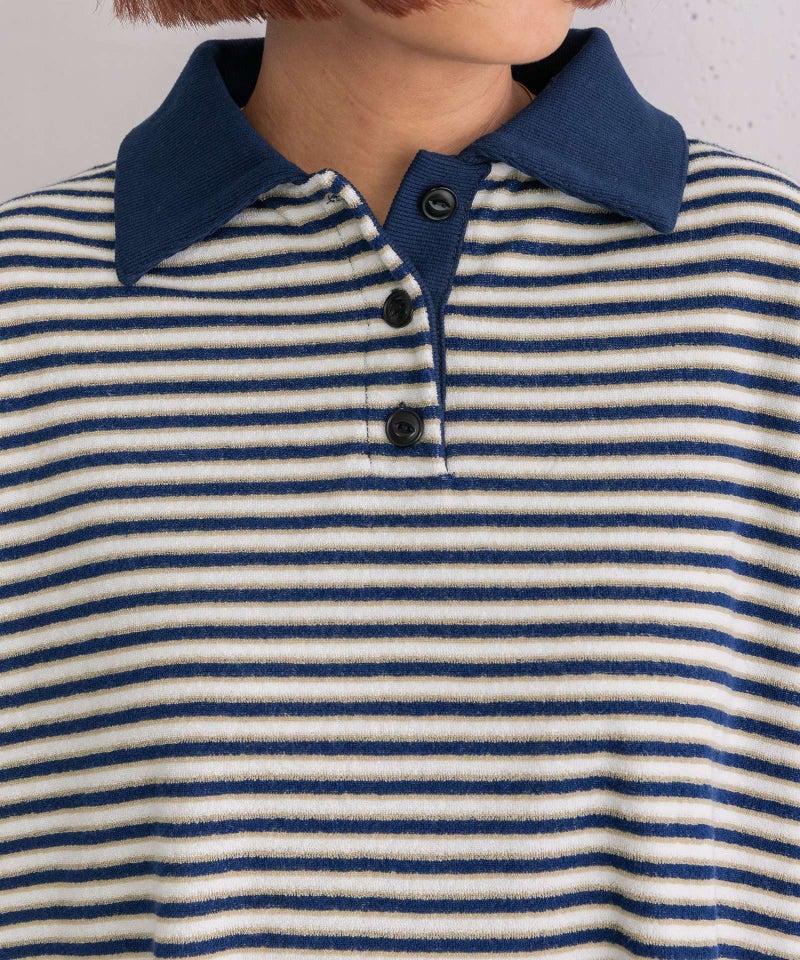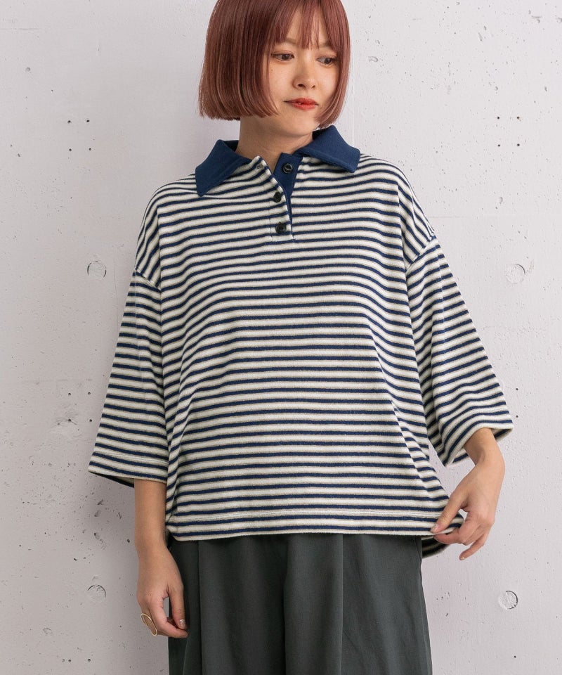 トレンド感のあるラガーシャツのようなデザインのトップス。やわらかな肌触りと伸縮性のあるパイル素材を使用した優しい着心地です。どこか懐かしさを感じるようなヴィンテージ風のボーダー柄がポイント。ゆとりある身巾に程よい着丈がこなれ感のあるデザインです。どんなボトムともバランス良く、ラフに合わせていただけるおすすめのアイテムです。