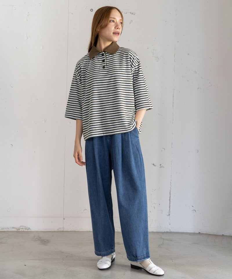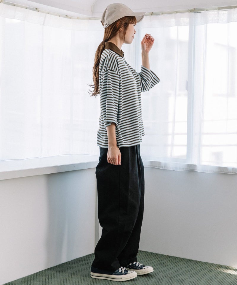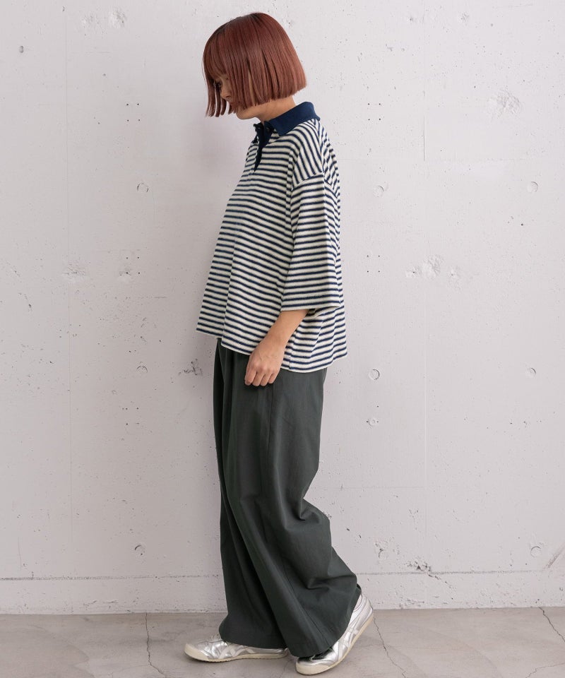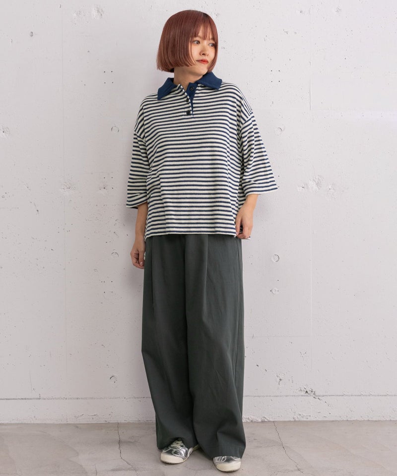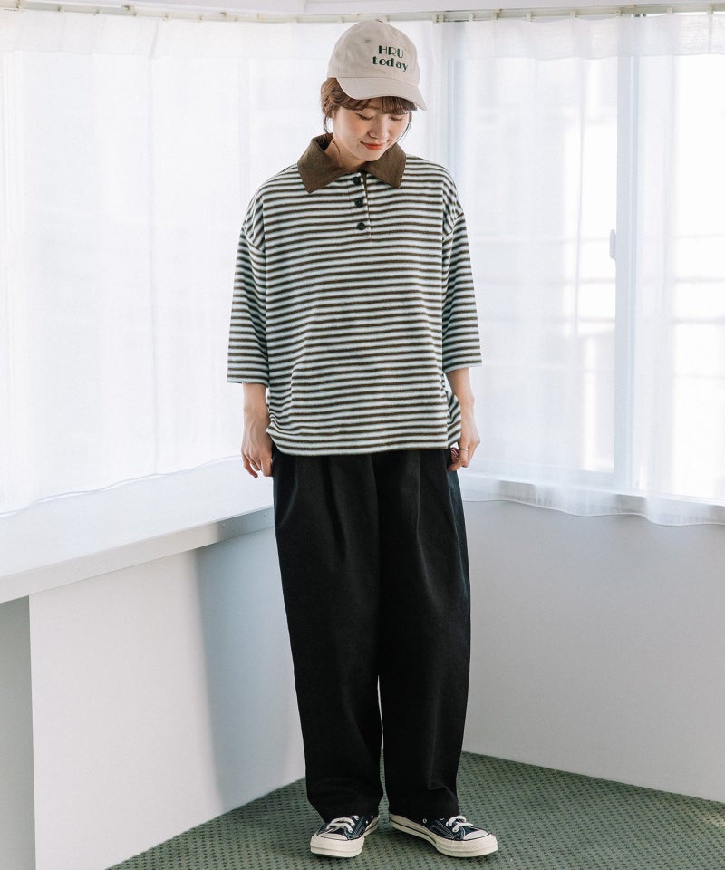 トレンド感のあるラガーシャツのようなデザインのトップス。やわらかな肌触りと伸縮性のあるパイル素材を使用した優しい着心地です。どこか懐かしさを感じるようなヴィンテージ風のボーダー柄がポイント。ゆとりある身巾に程よい着丈がこなれ感のあるデザインです。どんなボトムともバランス良く、ラフに合わせていただけるおすすめのアイテムです。