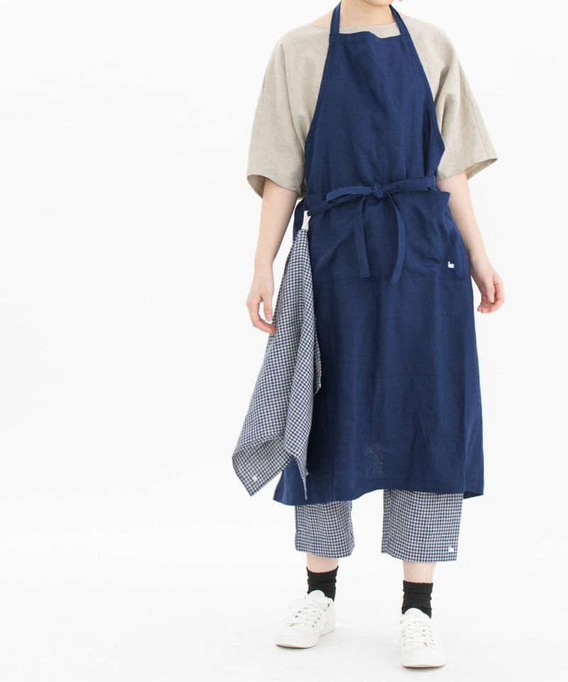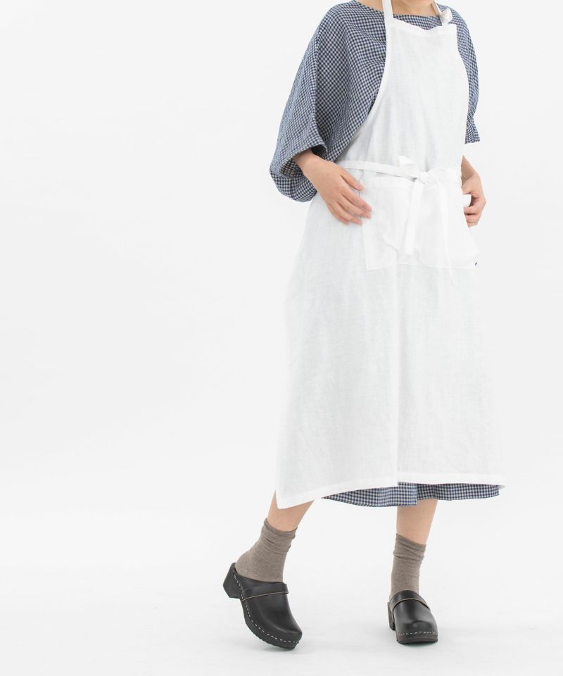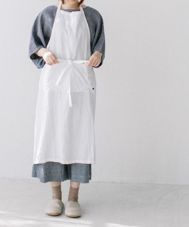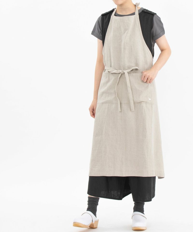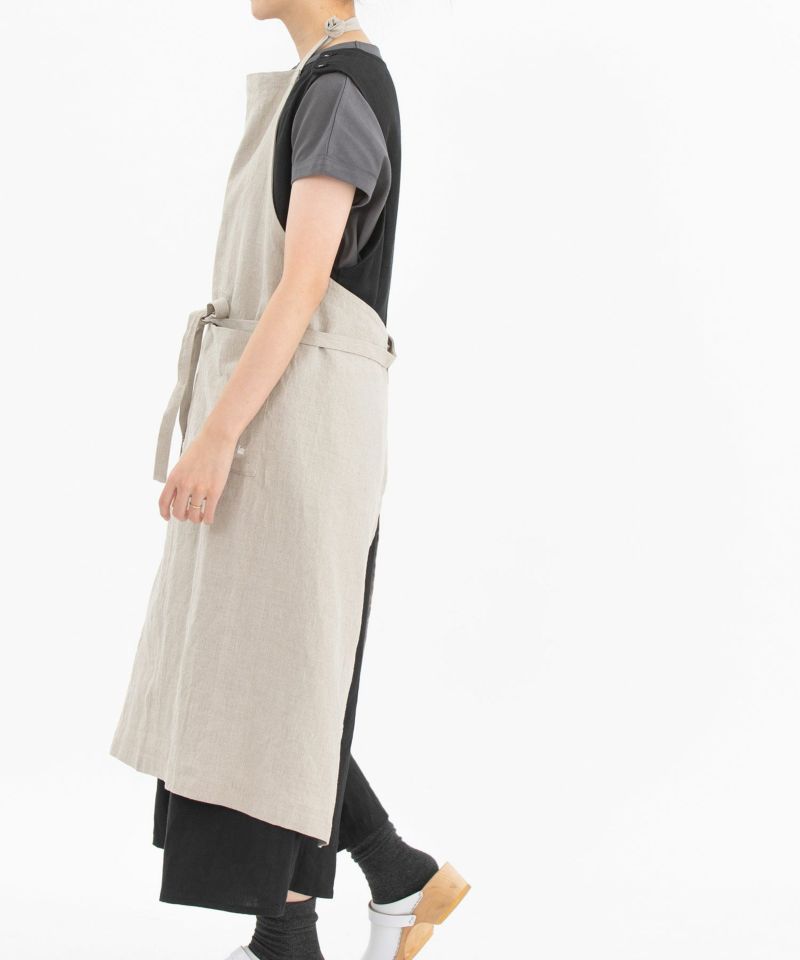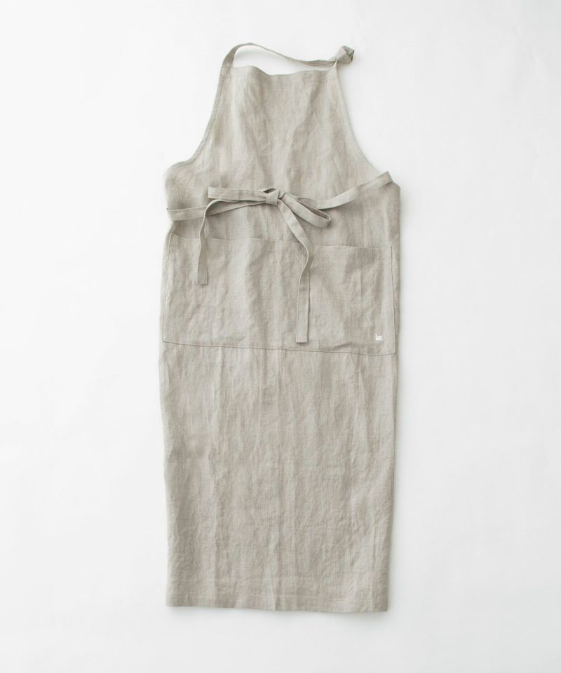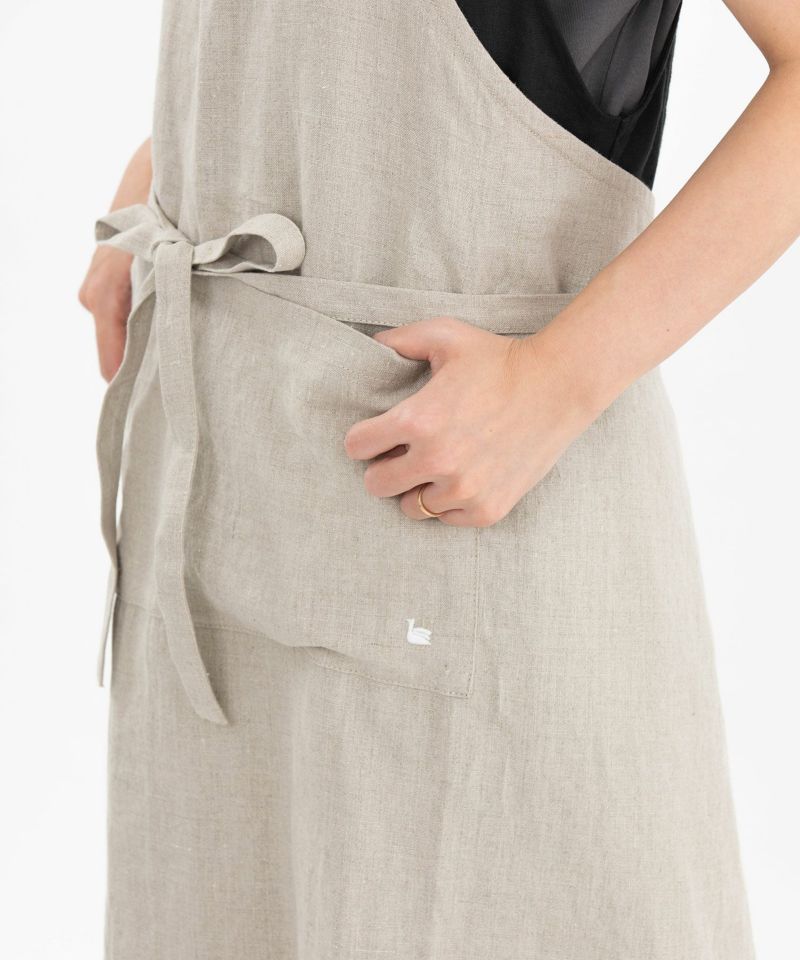 天然素材の中でもっとも丈夫と言われるリネンで仕立てたエプロン。吸水性がよく、水に濡れても乾きが早いため清潔にお使いいただけます。洗いざらしでもナチュラルな風合いがあり普段使いにぴったりです。ウエスト部分のヒモは前後どちらでも結べます。後ろでゆったり結んでも、前でキュッと結べば動く家事にも便利です。首かけタイプのヒモなので肩ヒモがずれてしまう煩わしさもありません。長さも調節していただけます。タオルなど作業に必要なアイテムをさっとしまいやすい大きめのポケットもポイント。キッチンはもちろん、お掃除やガーデニングなど様々なお家しごとにぴったりです。ひざ下まで覆ってくれる長めの丈なので、お洋服をしっかり汚れから守ってくれます。使うほどに愛着の沸くアイテムです。nop de nodのアイコンであるスワンをさりげなく刺繍してあります。プレゼントにもおすすめです。