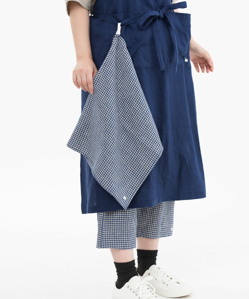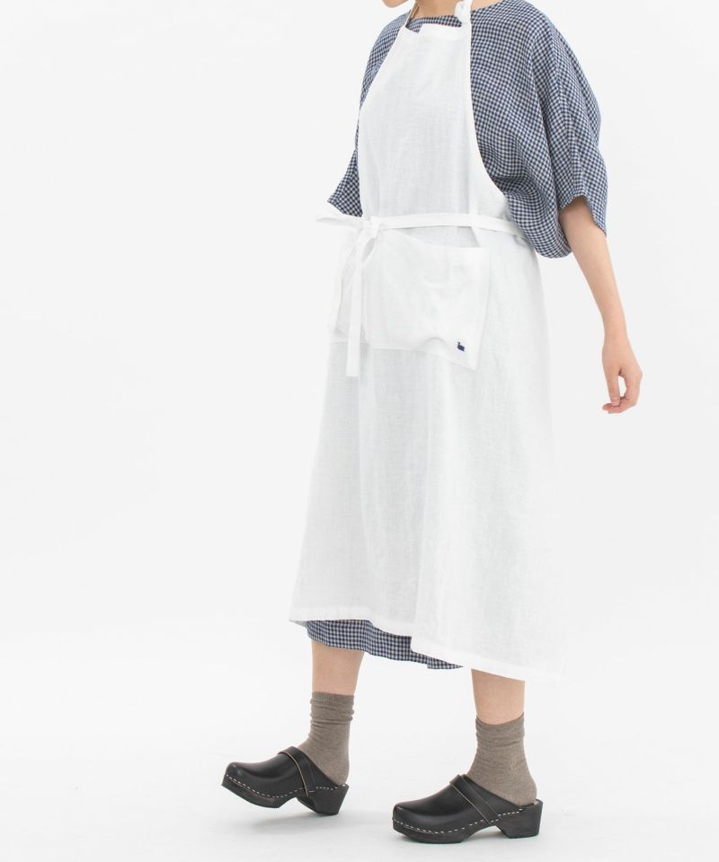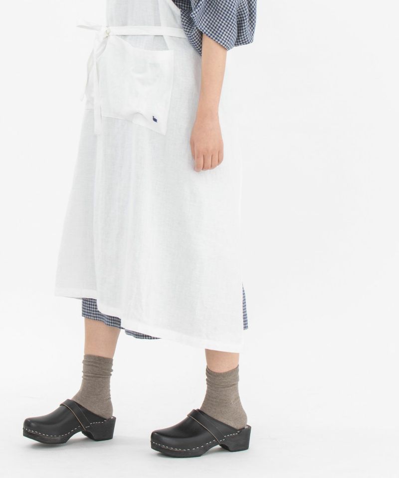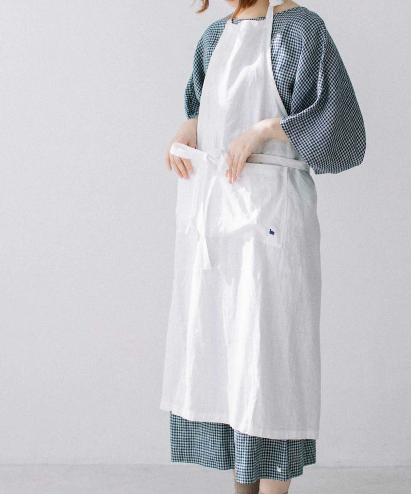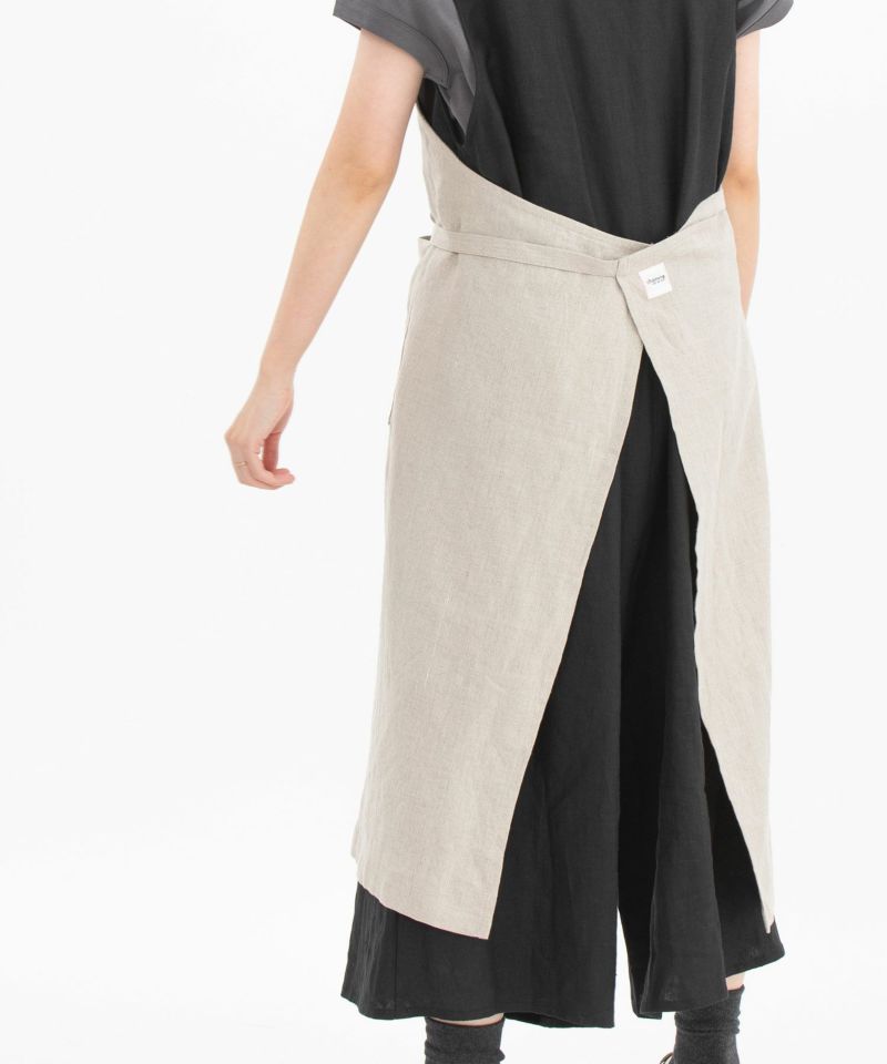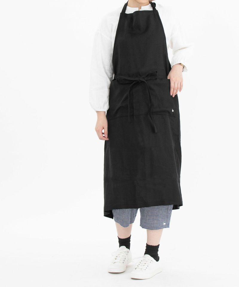 天然素材の中でもっとも丈夫と言われるリネンで仕立てたエプロン。吸水性がよく、水に濡れても乾きが早いため清潔にお使いいただけます。洗いざらしでもナチュラルな風合いがあり普段使いにぴったりです。ウエスト部分のヒモは前後どちらでも結べます。後ろでゆったり結んでも、前でキュッと結べば動く家事にも便利です。首かけタイプのヒモなので肩ヒモがずれてしまう煩わしさもありません。長さも調節していただけます。タオルなど作業に必要なアイテムをさっとしまいやすい大きめのポケットもポイント。キッチンはもちろん、お掃除やガーデニングなど様々なお家しごとにぴったりです。ひざ下まで覆ってくれる長めの丈なので、お洋服をしっかり汚れから守ってくれます。使うほどに愛着の沸くアイテムです。nop de nodのアイコンであるスワンをさりげなく刺繍してあります。プレゼントにもおすすめです。