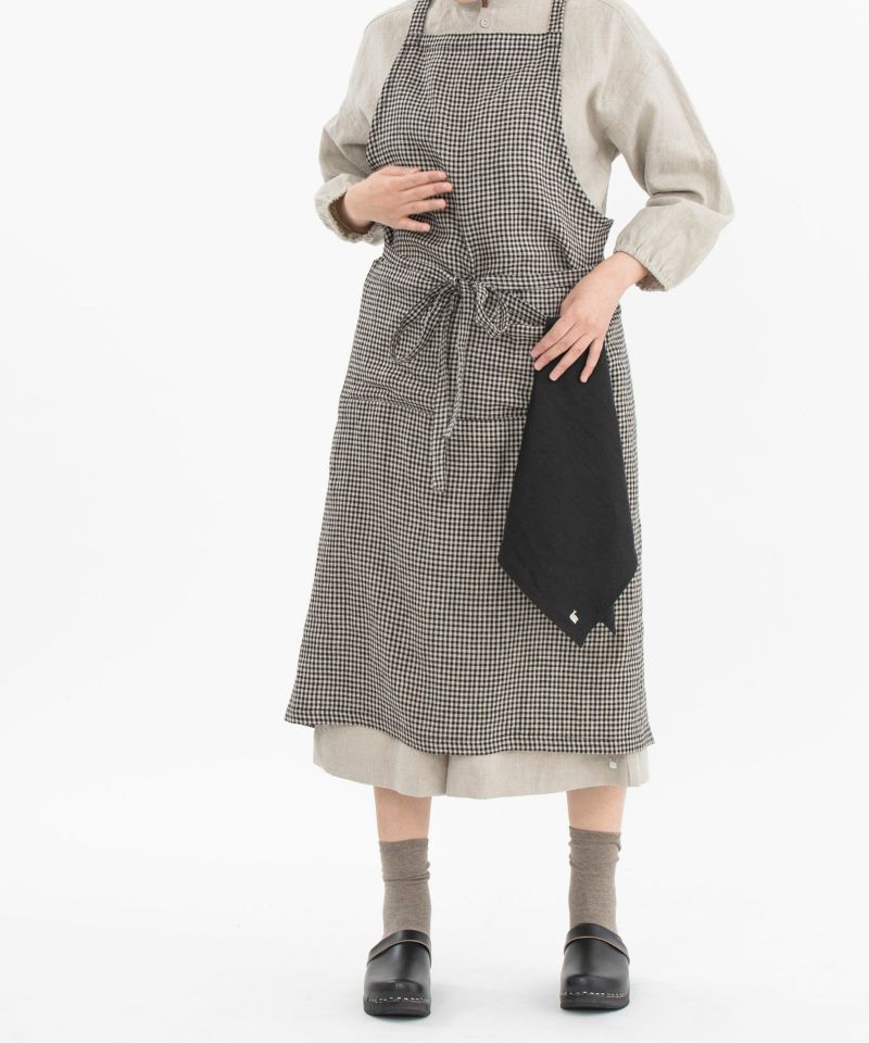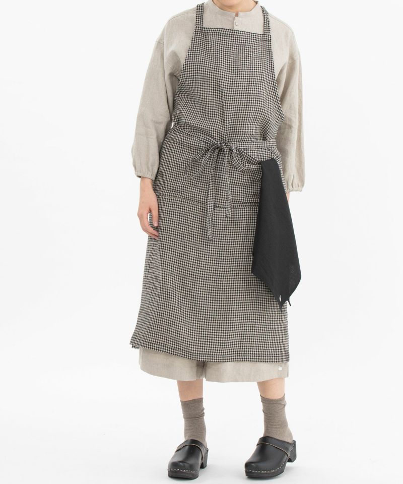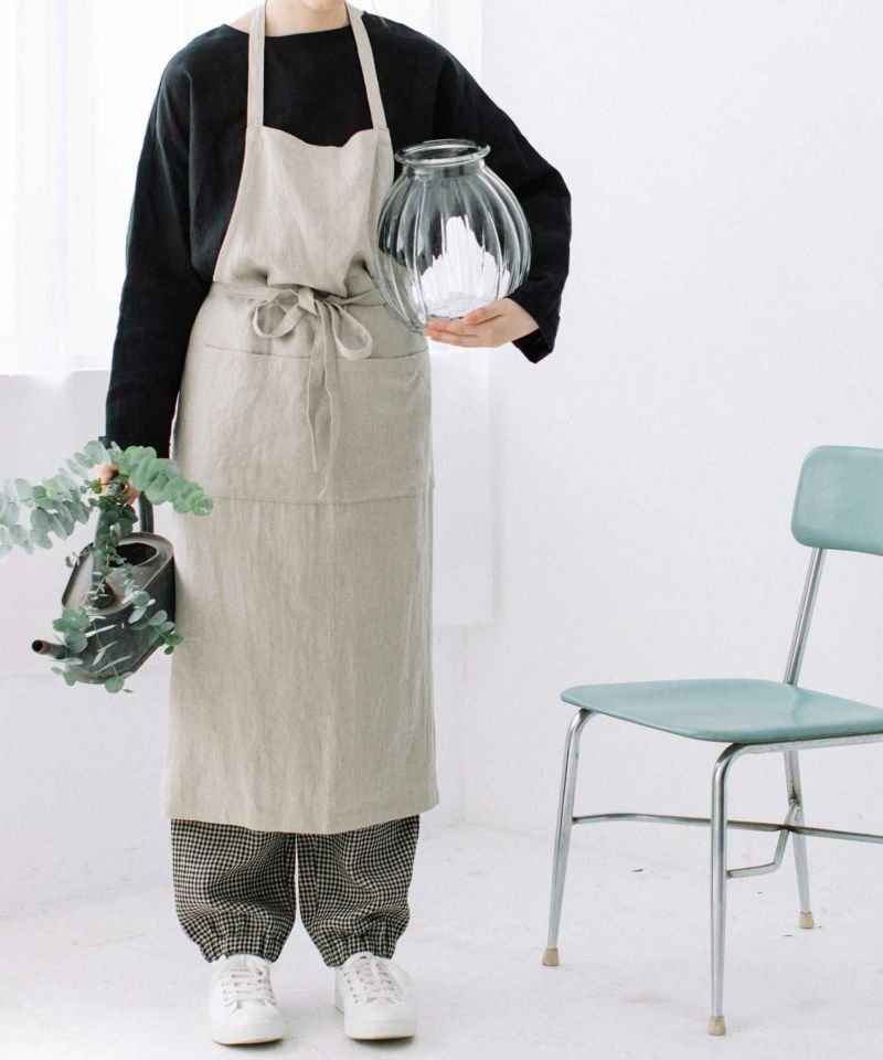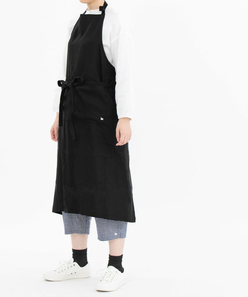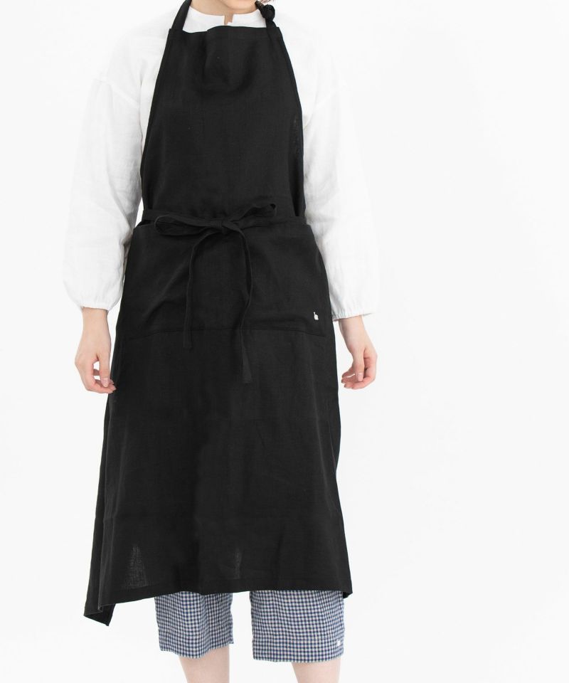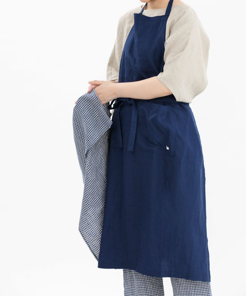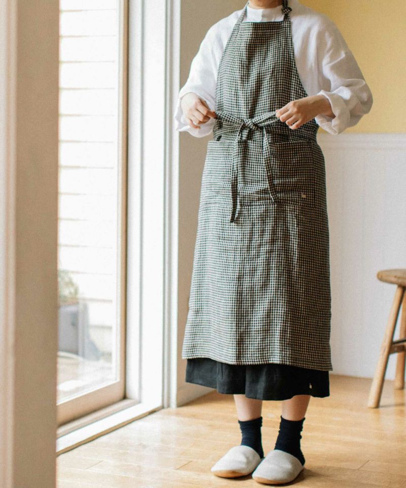 天然素材の中でもっとも丈夫と言われるリネンで仕立てたエプロン。吸水性がよく、水に濡れても乾きが早いため清潔にお使いいただけます。洗いざらしでもナチュラルな風合いがあり普段使いにぴったりです。ウエスト部分のヒモは前後どちらでも結べます。後ろでゆったり結んでも、前でキュッと結べば動く家事にも便利です。首かけタイプのヒモなので肩ヒモがずれてしまう煩わしさもありません。長さも調節していただけます。タオルなど作業に必要なアイテムをさっとしまいやすい大きめのポケットもポイント。キッチンはもちろん、お掃除やガーデニングなど様々なお家しごとにぴったりです。ひざ下まで覆ってくれる長めの丈なので、お洋服をしっかり汚れから守ってくれます。使うほどに愛着の沸くアイテムです。nop de nodのアイコンであるスワンをさりげなく刺繍してあります。プレゼントにもおすすめです。