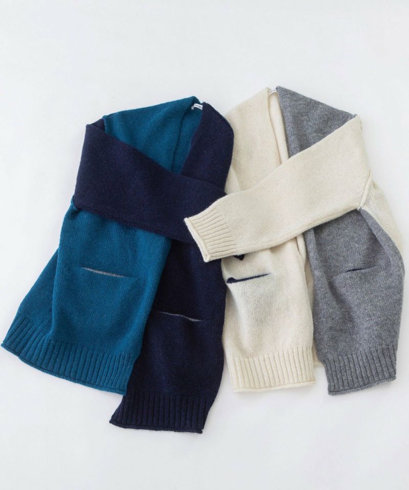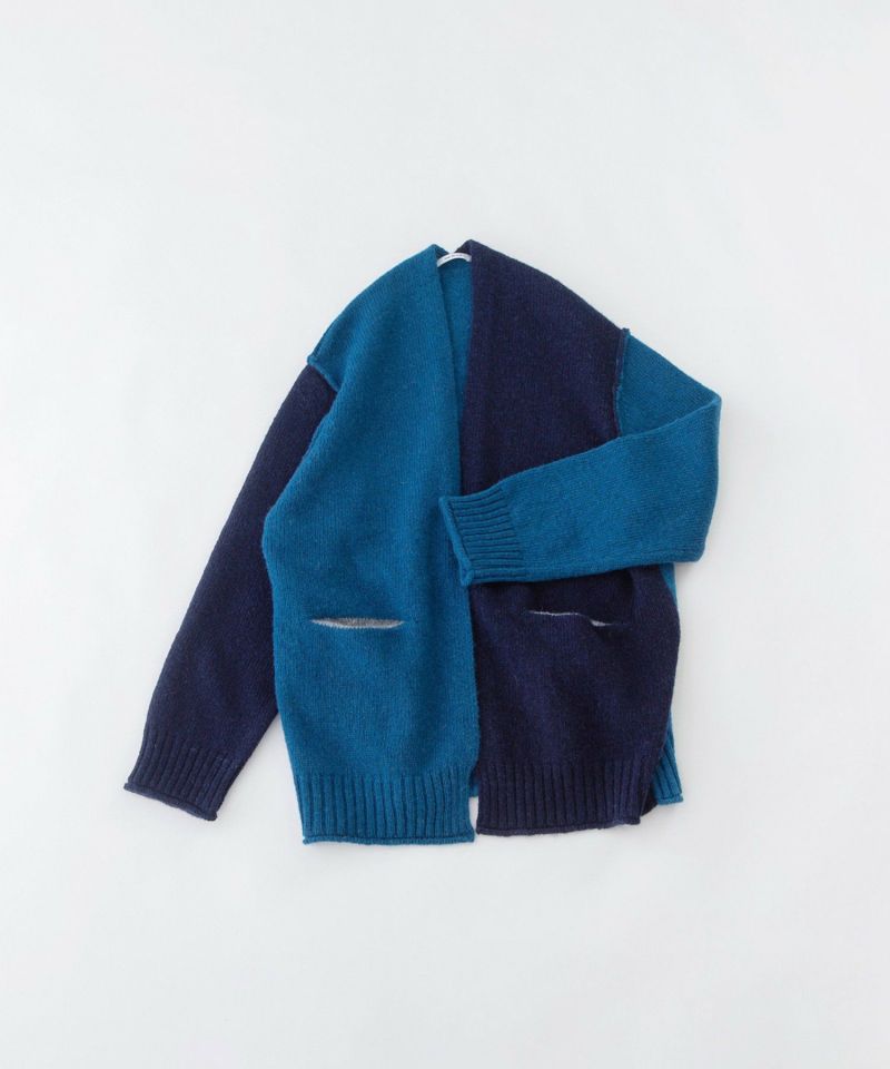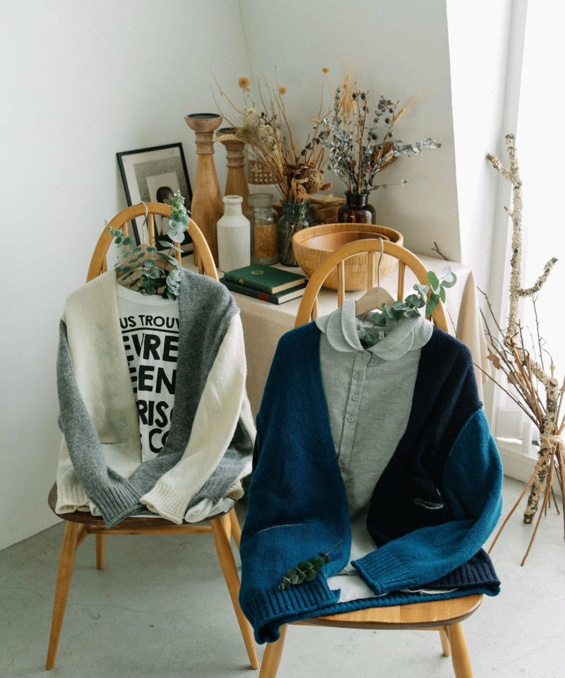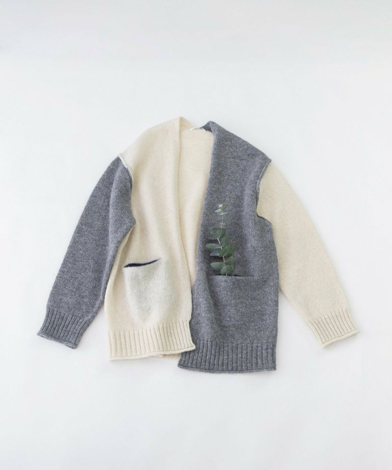 ふんわり軽やかで暖かいシェットランドで編み立てた、nop de nodではおなじみのカーディガン。3色を組み合わせたカーディガンはノーボタンでさらっと羽織れ、ワンピースからスカート・パンツまで幅広く着られます。ふくらみがありつつ、程よい厚みでコートインも可能。ちらりと見える丸くあいたポケットの配色もアクセントに。