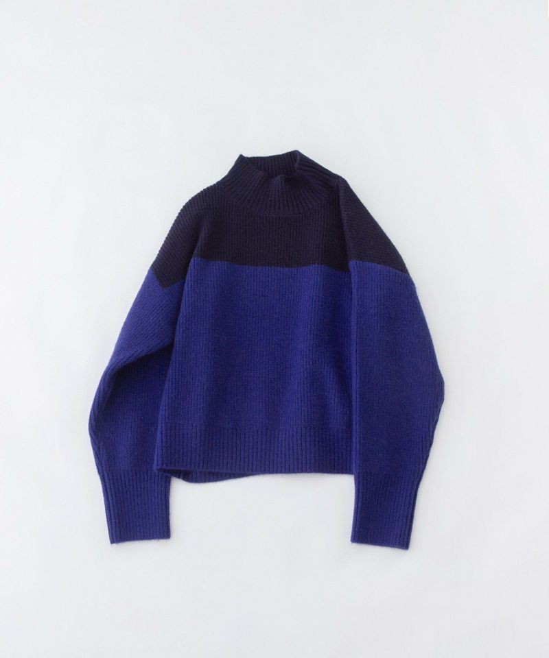 厚みがあり、柔らかくて暖かい片畦編みのバイカラーニット。ハイネックとヨークがさりげない同系色の配色になっています。長めのリブもアクセントを効かせています。