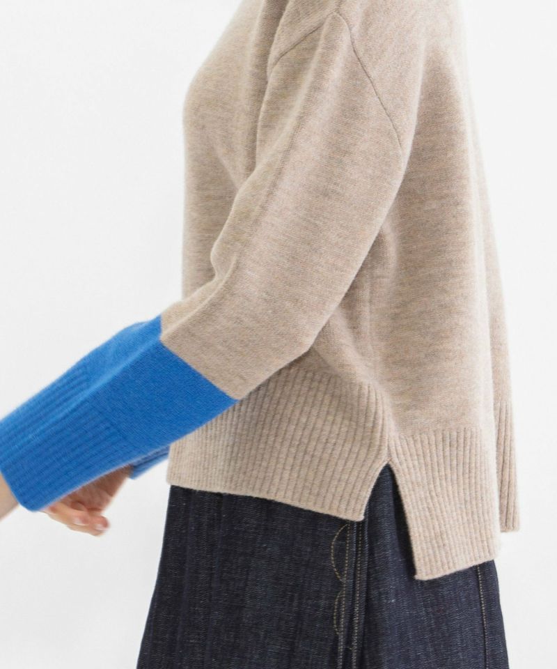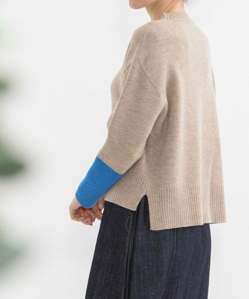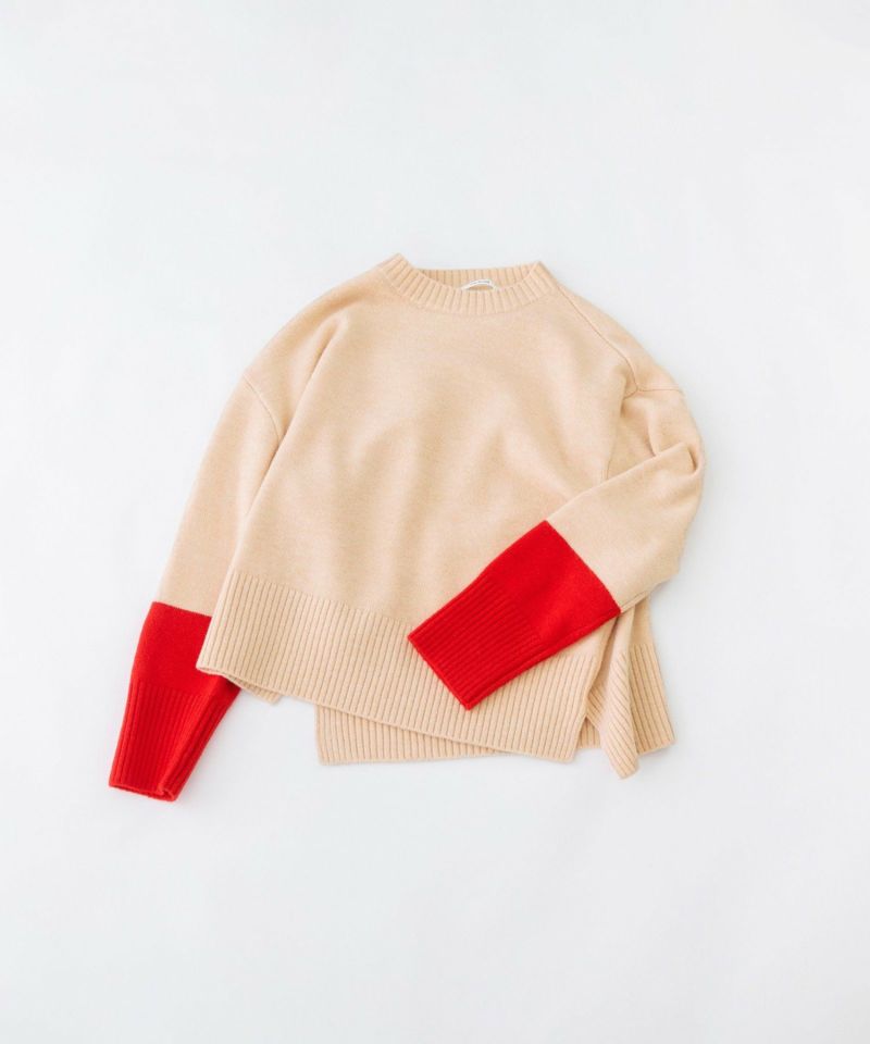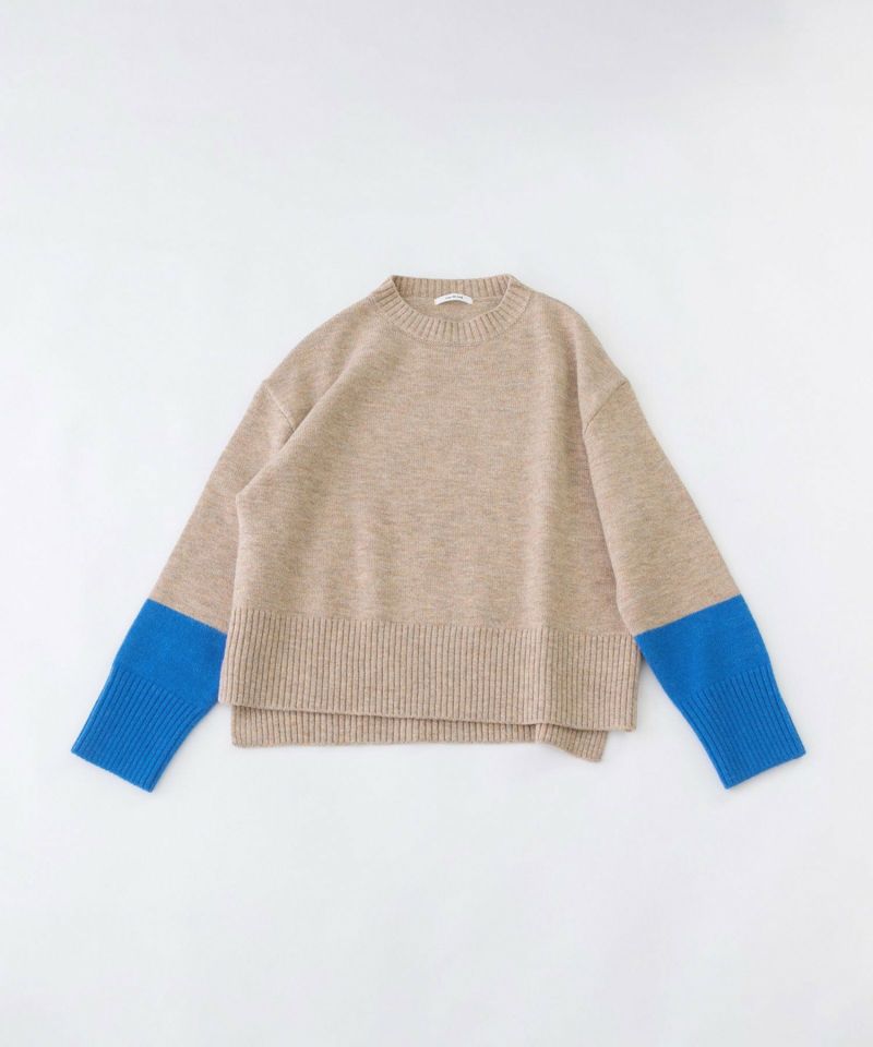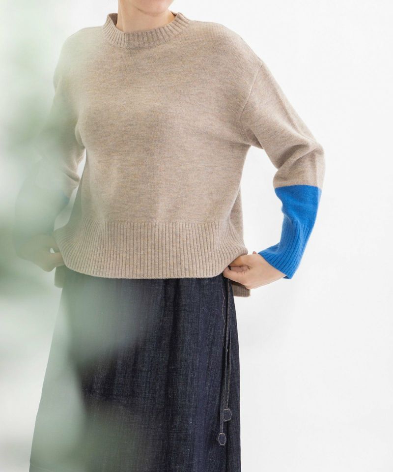 程よく厚みがあるざっくり天竺編みのクルーネックニット。シンプルでナチュラル色のボディーに、意表をついた鮮やかな袖口の配色がアクセントを効かせています。後ろが長めの前後差デザインです。