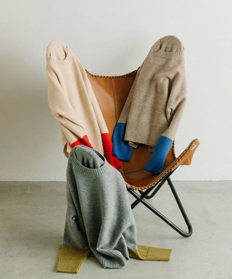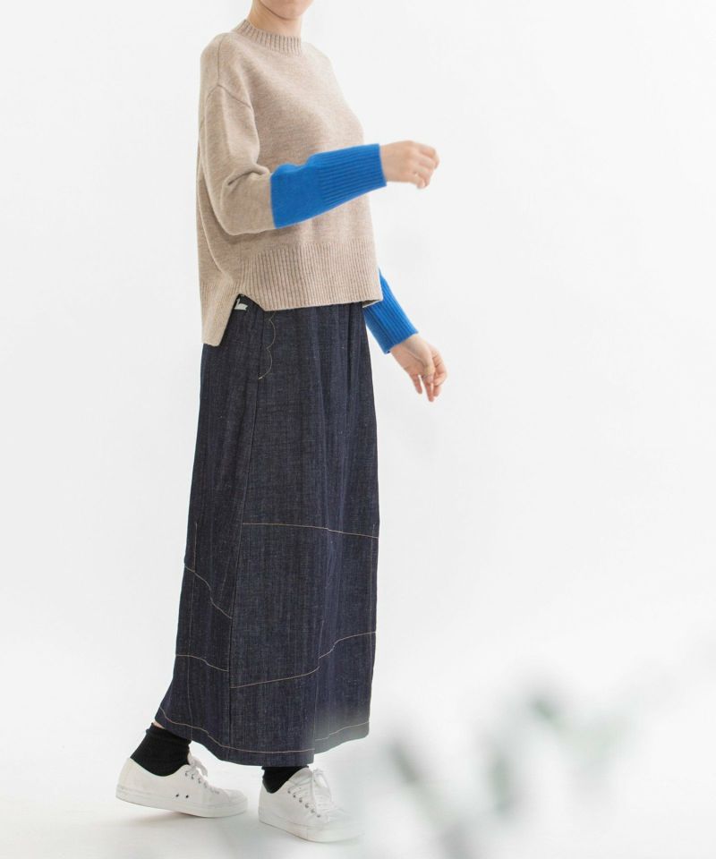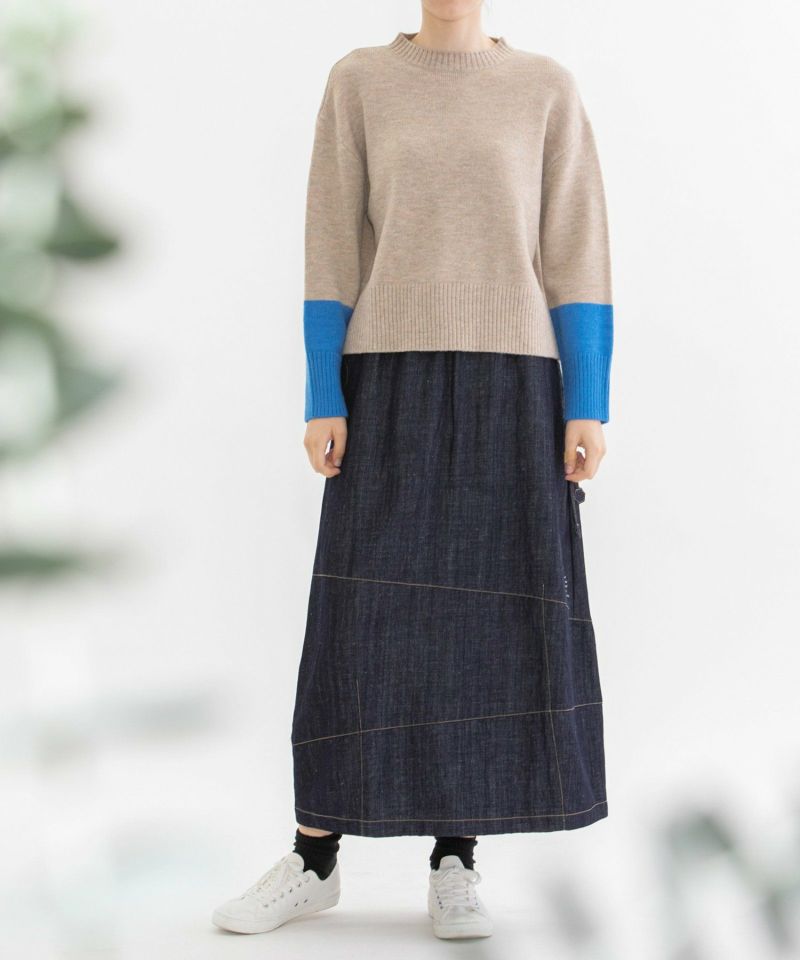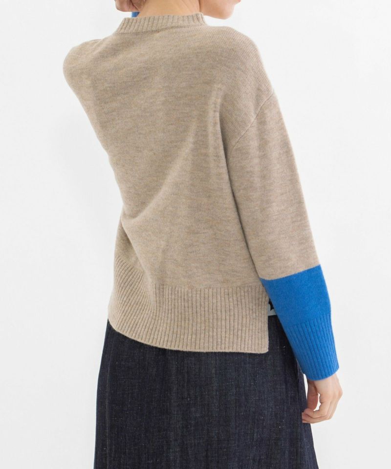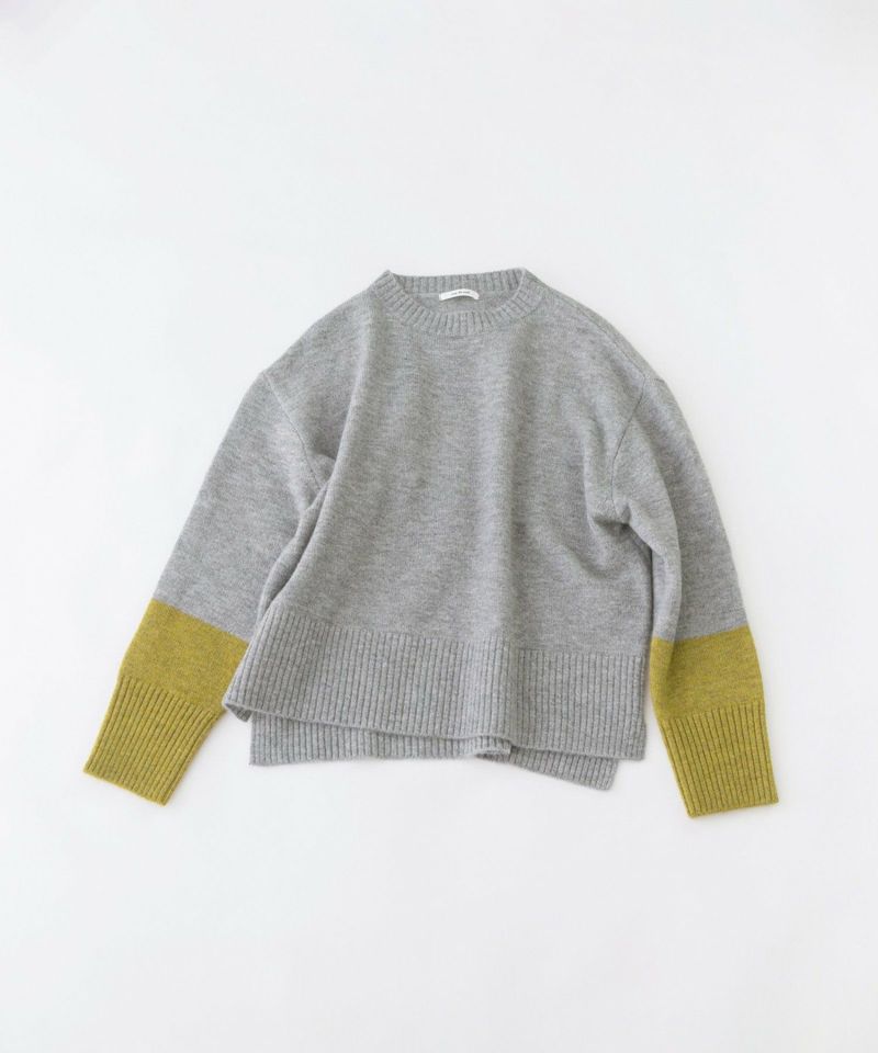 程よく厚みがあるざっくり天竺編みのクルーネックニット。シンプルでナチュラル色のボディーに、意表をついた鮮やかな袖口の配色がアクセントを効かせています。後ろが長めの前後差デザインです。
