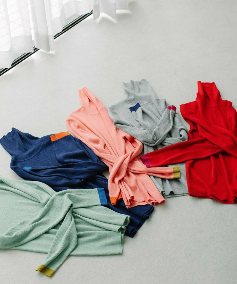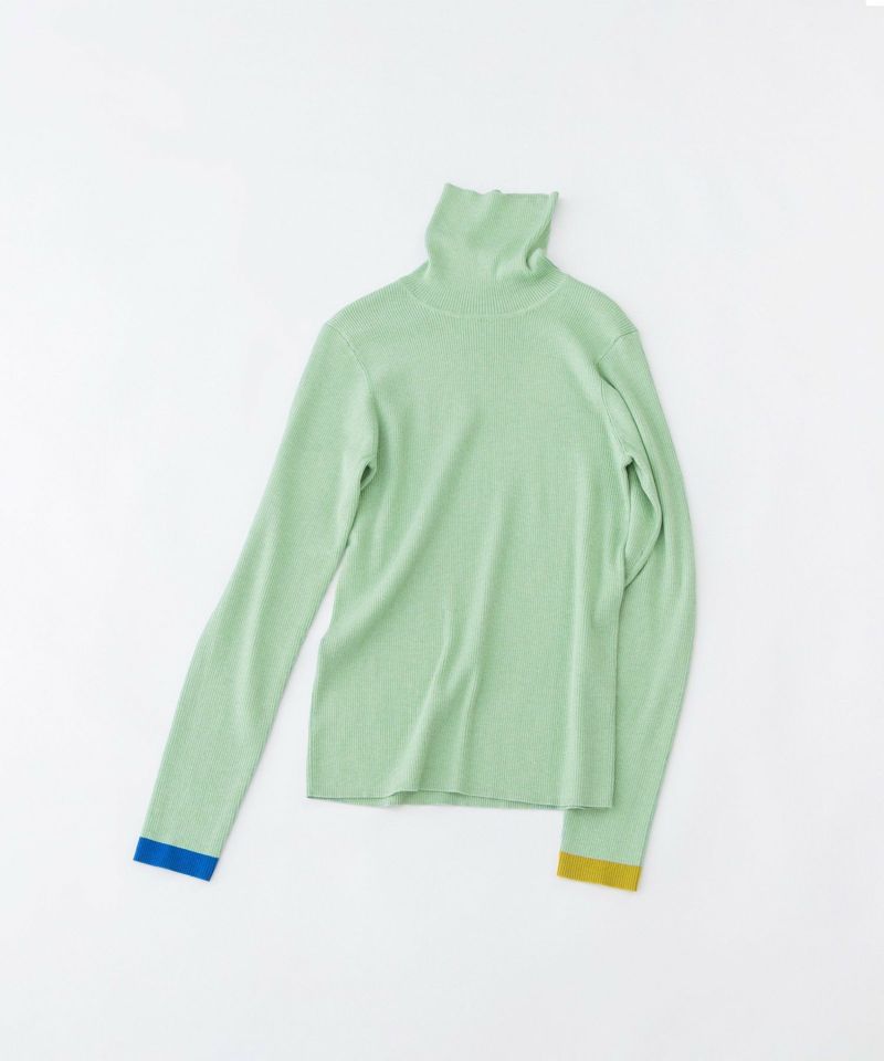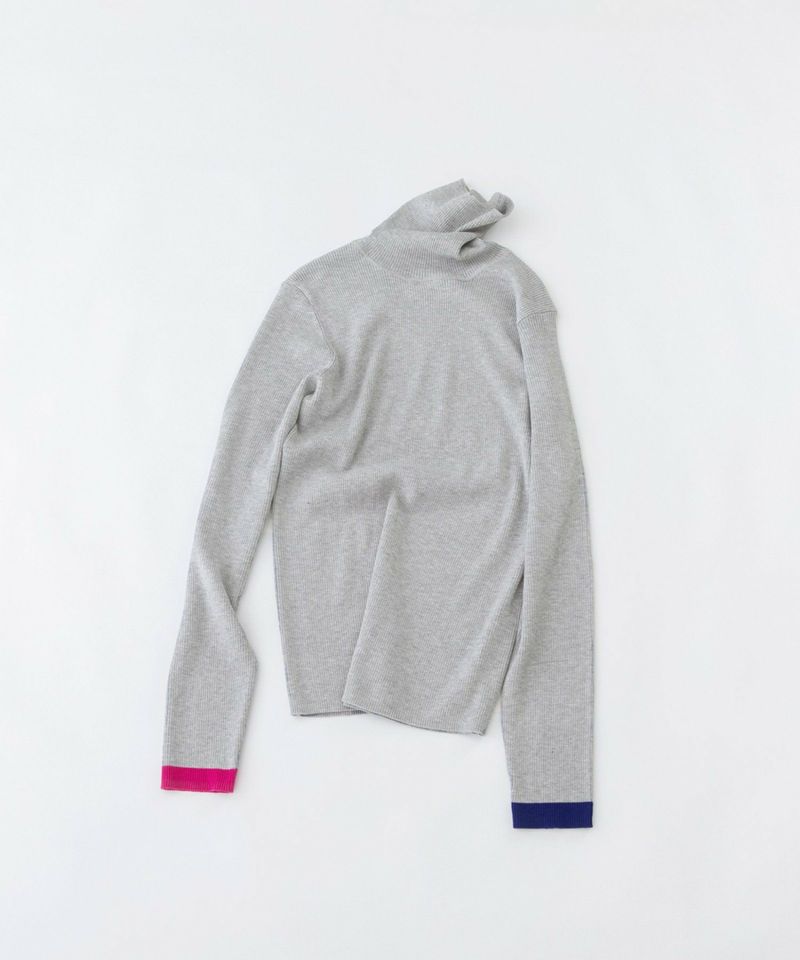 わずかにウールが入った、薄手のやわらかくて暖かいリブタートルニット。左右の袖口にそれぞれ違う色で配色ラインを入れました。1枚ではもちろん、シャツやワンピースのインから長めの袖を見せたくなる鮮度のあるインナーです。