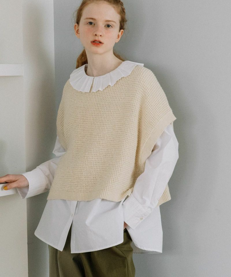 ナチュラルな風合いが魅力のワッフル編みニットベスト。スラブヤーンの表情豊かな糸で、ほんのりラフなムードに仕上げました。ワイドなシルエットとショート丈のバランスが今っぽく、ロンTやシャツとのレイヤードで、こなれ感のあるカジュアルスタイルが完成します。