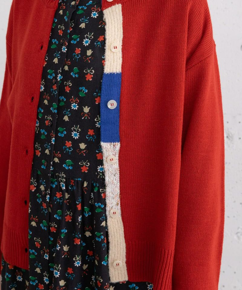 ボタンを開けた時に見える下前立てに異素材を組み合わせ、遊び心を利かせたデザインのPOU DOU DOU定番カーディガン。ウールブレンドの暖かみのある糸で編み立てました。ドロップショルダーにゆとりのある袖巾で、重ね着しやすく重宝する1枚です。