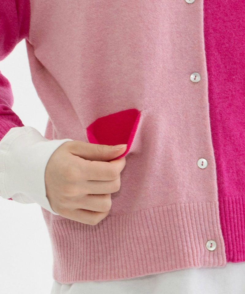 薄手でも暖かい、エクストラファインメリノ糸を使った定番カーディガン。同系色の3色を組み合わせています。ゆとりのある身巾とドロップショルダーでリラックスした着心地。バランスよく着られるジャスト丈です。