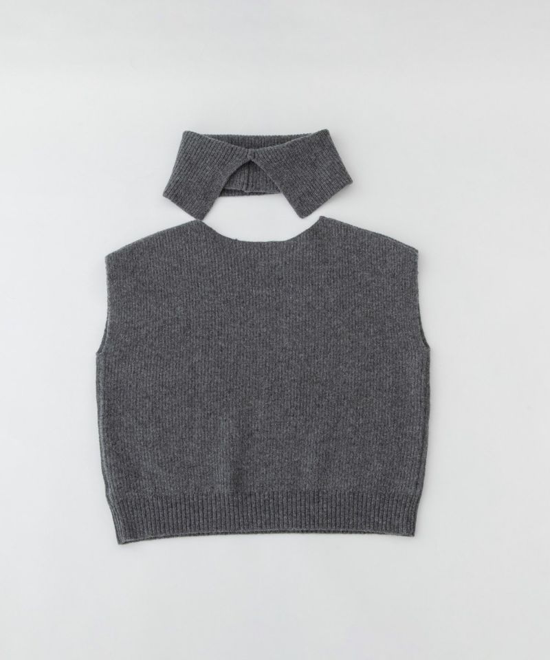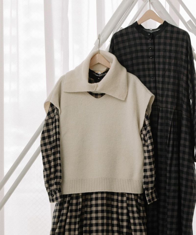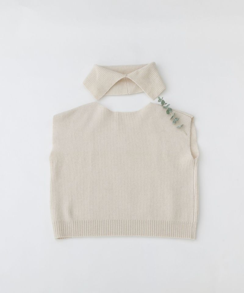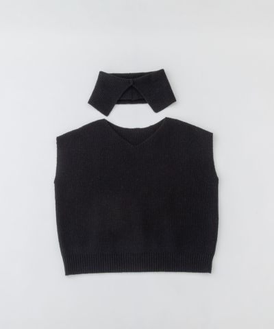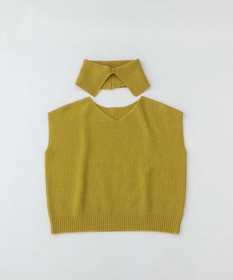 ・ざっくりとした片畦編みでのニットベスト。クルーネックととVネックどちらを前にしても楽しめる2way仕様。付属の衿型のネックウォーマーで襟付きベストのようにも着られます。