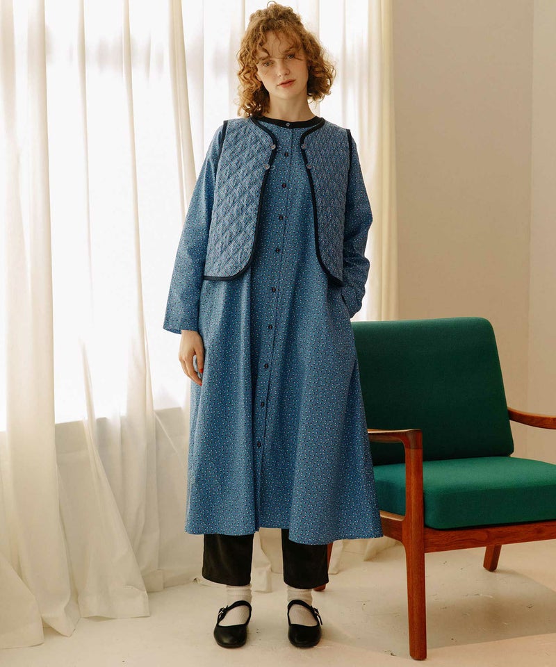 ・POU DOU DOU オリジナルの3色ドットのテキスタイルを使ったワンピース。衿ぐりと配色のボタン使いがポイントです。
