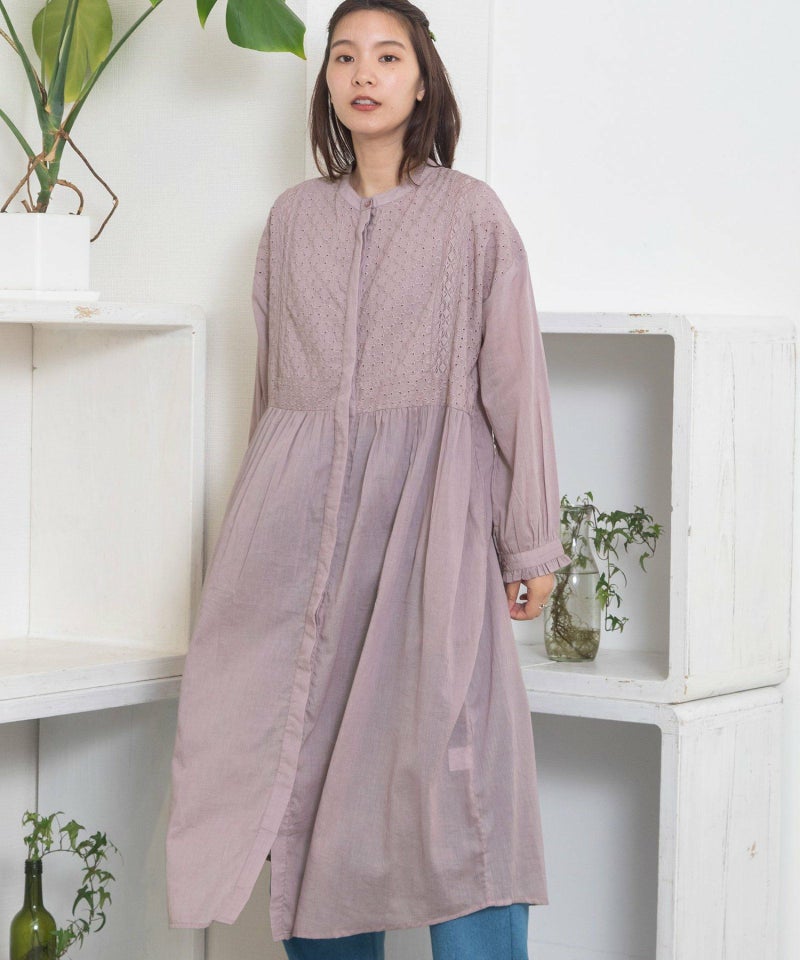 ・身頃をレースやエンブロ生地で切り替えた特別感のあるワンピース。デニムやニットと相性の良い、程よく甘さのあるアイテムです。