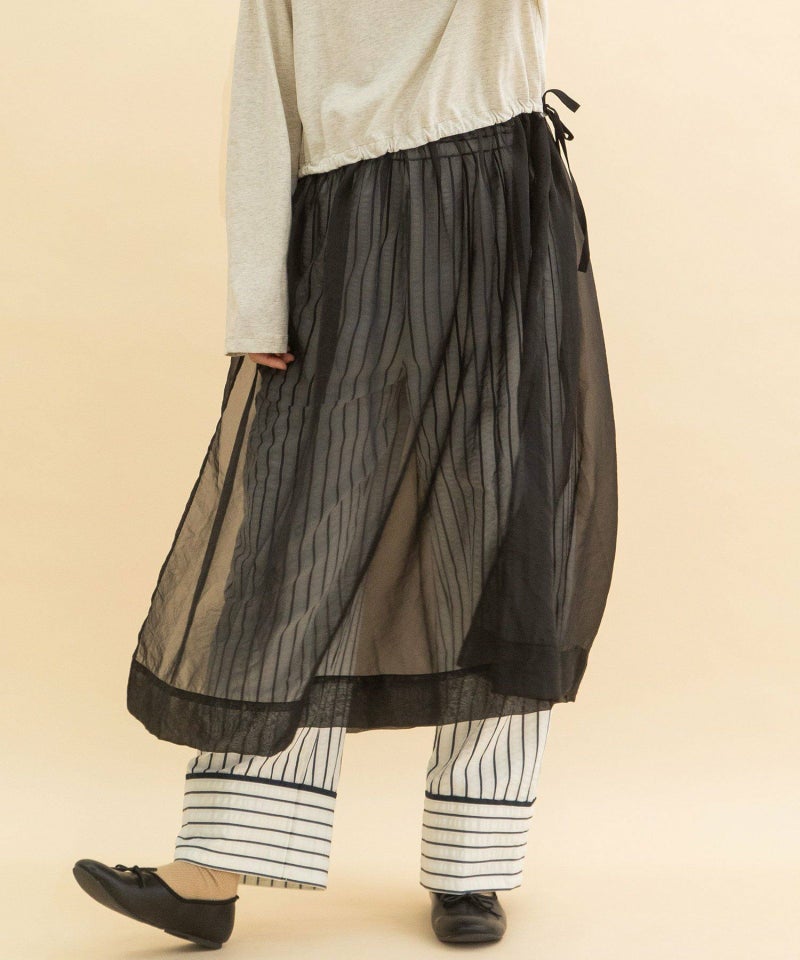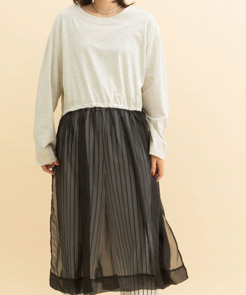 カットソー素材とシアー感のあるオーガンジーをドッキングしたワンピース。首回りはクルーネックでスッキリとしたデザイン。ウエスト周りはゆったりと、リボンを通しているのでお好みのサイズ感で着用いただけます。