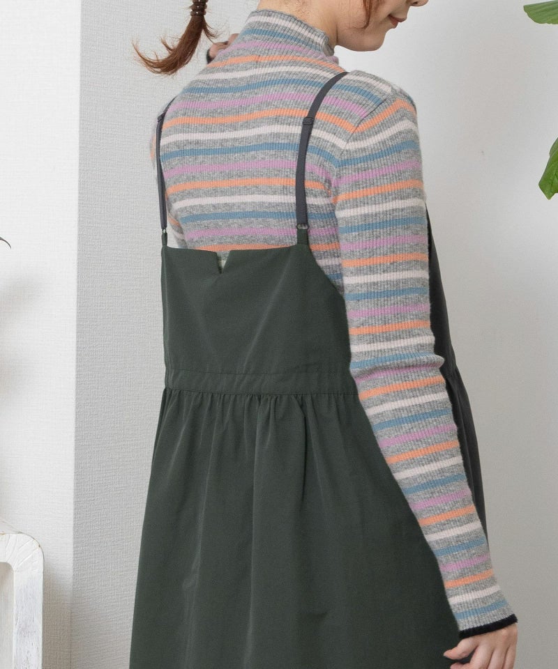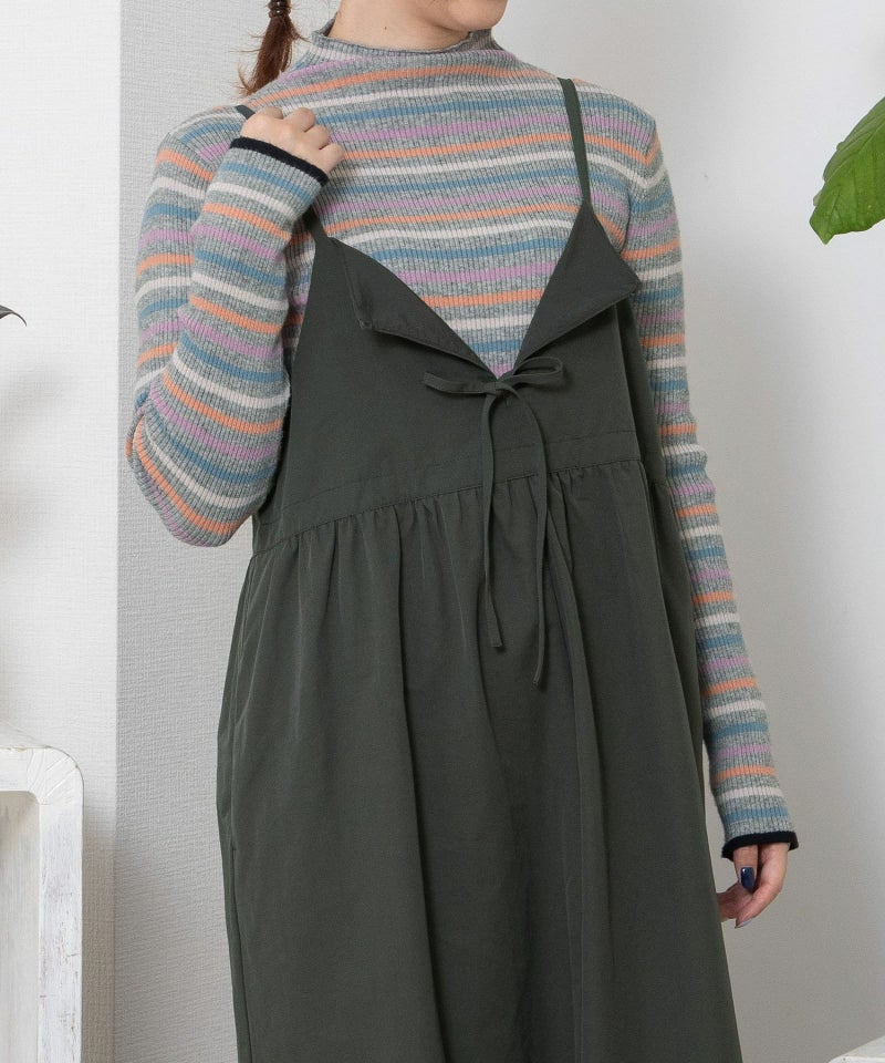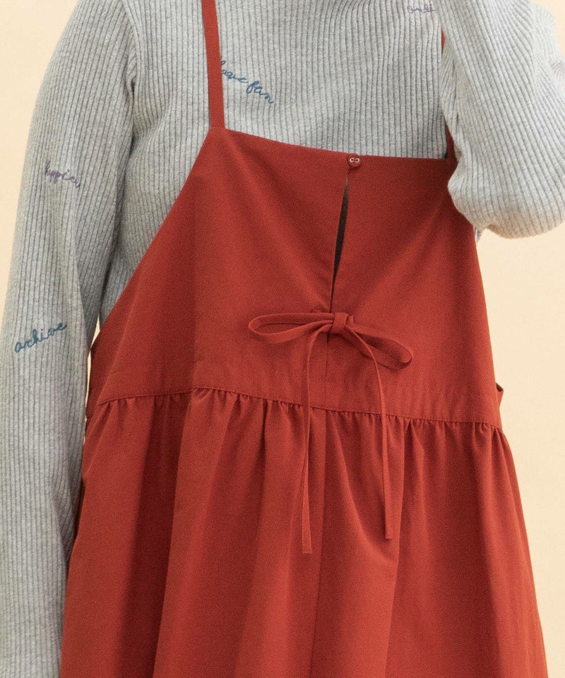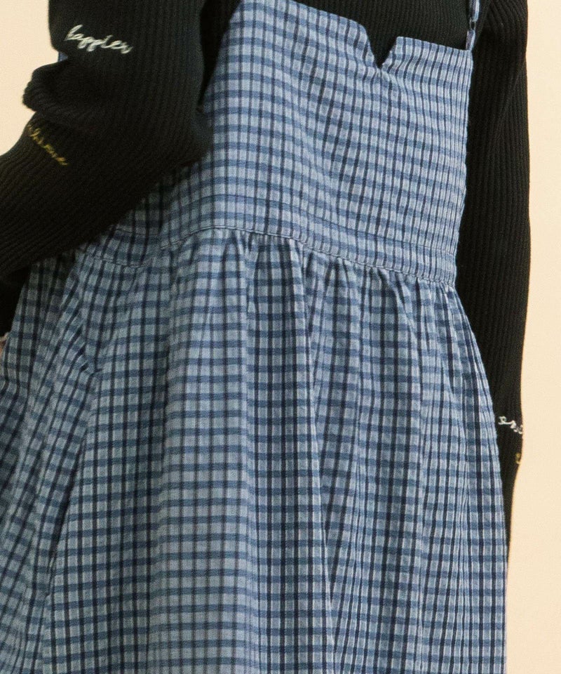 フロントリボンがアクセントのキャミワンピース。トレンド感のある肩紐細めのデザインで、フロントリボンはお好みで結んだり垂らしたりして頂けます。インナー次第で幅広く着回しができるアイテム。無地はやや張りのあるコットンナイロン素材を使用、チェックはぽこぽこした表面感の少し柔らかい素材です。アジャスターで長さの調節もできます。両サイドにポケットつき。