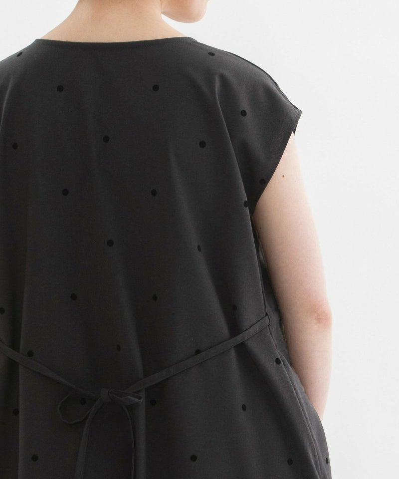クラシカルな雰囲気のノースリーブワンピース。秋や春の端境の季節のきちんとしたい時期に重宝するフォーマル生地の「トロピカル」で仕立てました。ポリエステルレーヨンで、しわになりにくくイージーケアがうれしいシリーズです。肩にかかる袖丈で1枚での着用はもちろん、薄手インナーを合わせてジャンスカとしても着られます。前後どちらでも着用可能で、ウエストを絞って表情の変化も楽しめます。フロッキーのドットプリントとブラックの2色展開。両サイドポケット付き