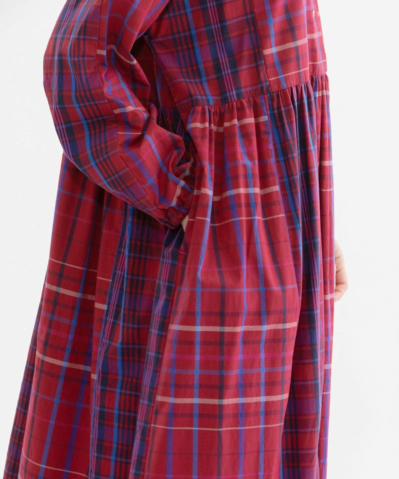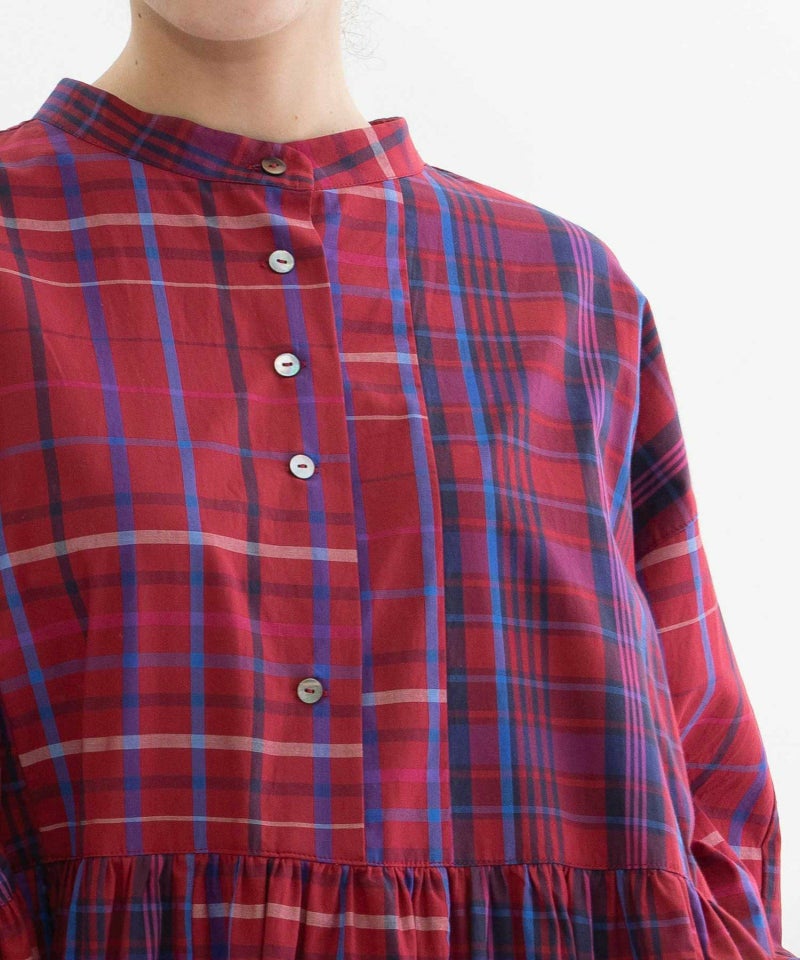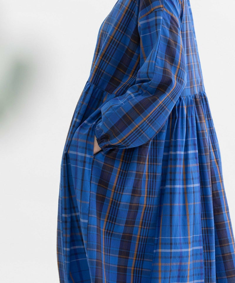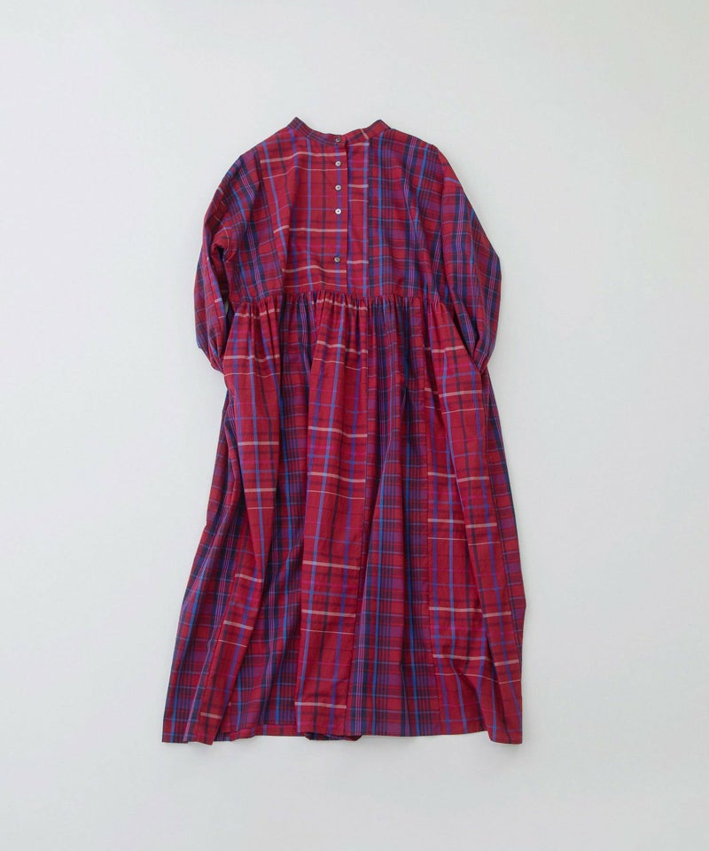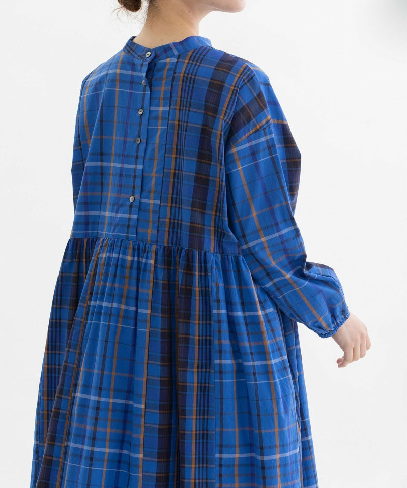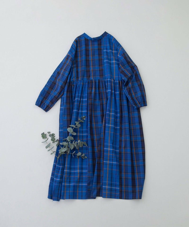 緻密で張りのあるタイプライター生地のオリジナルチェック2種を組み合わせたワンピース。つまりすぎないボトルネックで、前後どちらでも楽しめる2way仕様。ゆったりリラックスした長めのシルエットで、ストンと落ちつつ脇が垂れるこなれ感が魅力です。ベストやニットなどのレイヤードも楽しめます。ふんわりした袖口ゴムが着やすく、上部だけ狭くしたボタン間隔もデザインポイント。両サイドポケット付き。