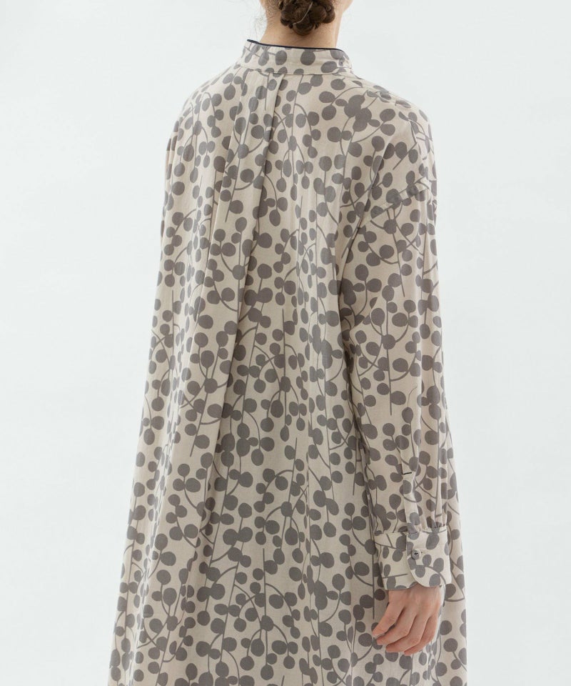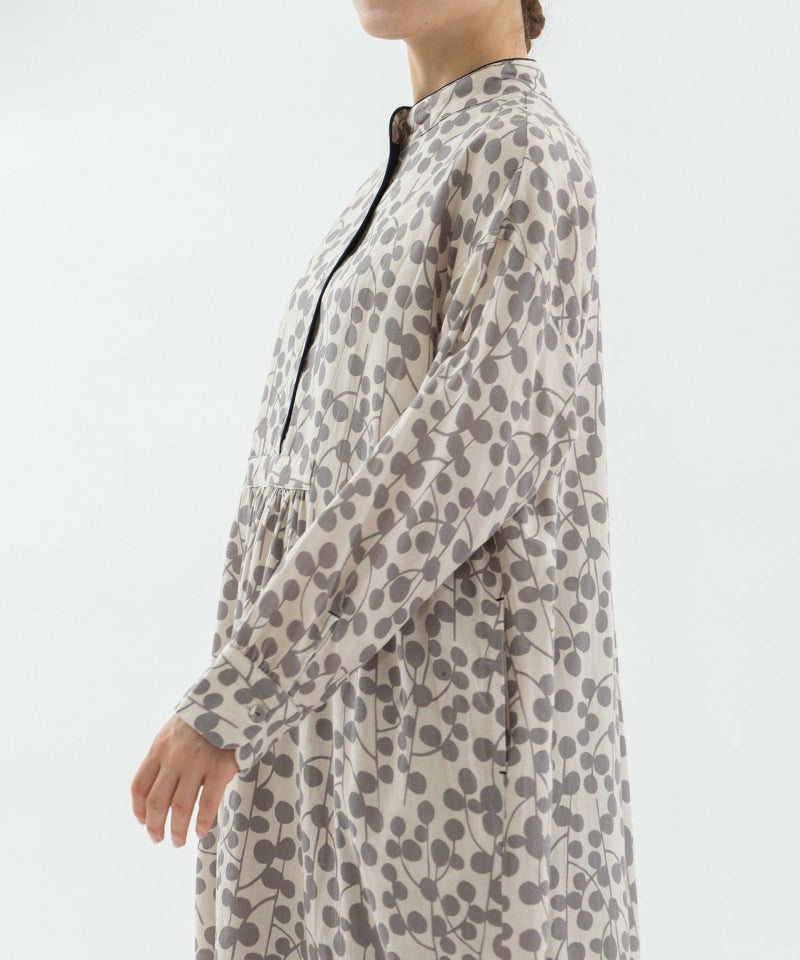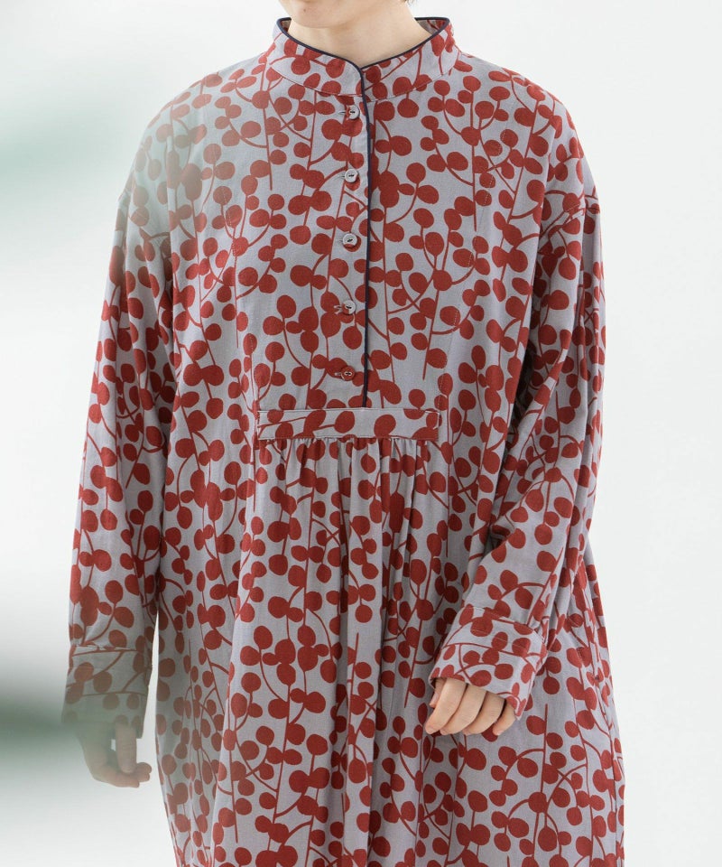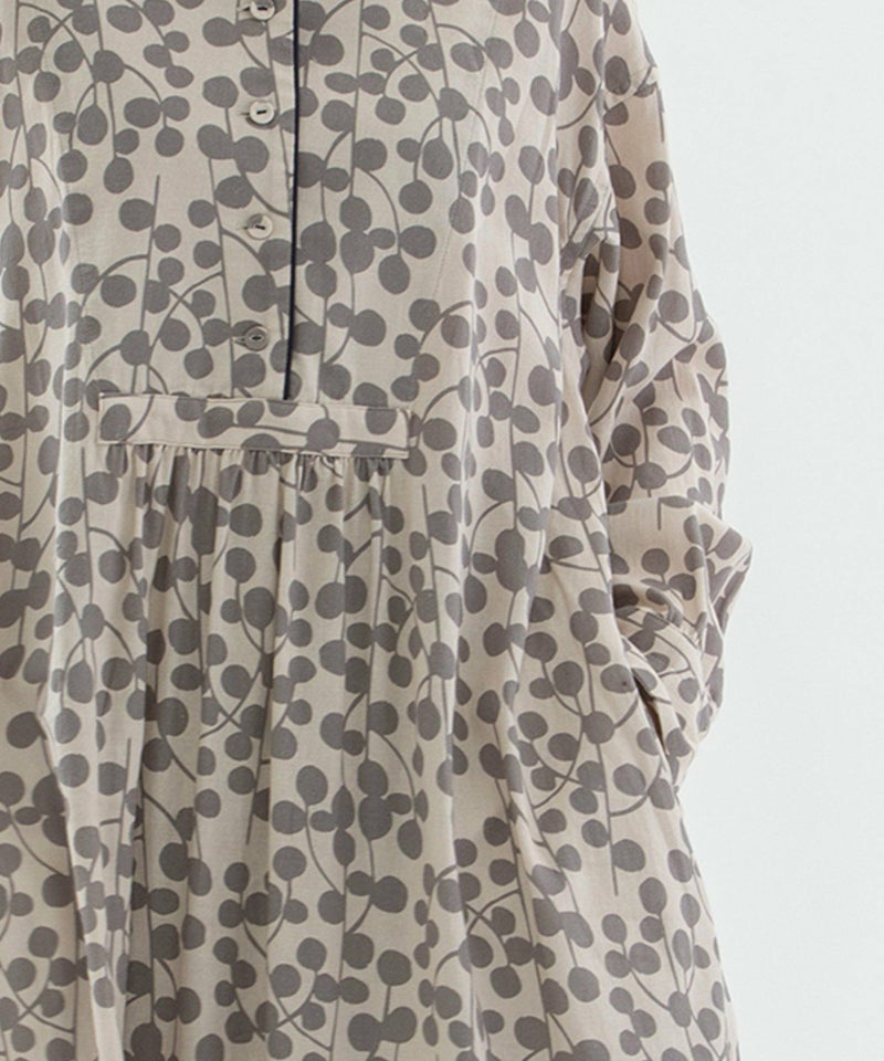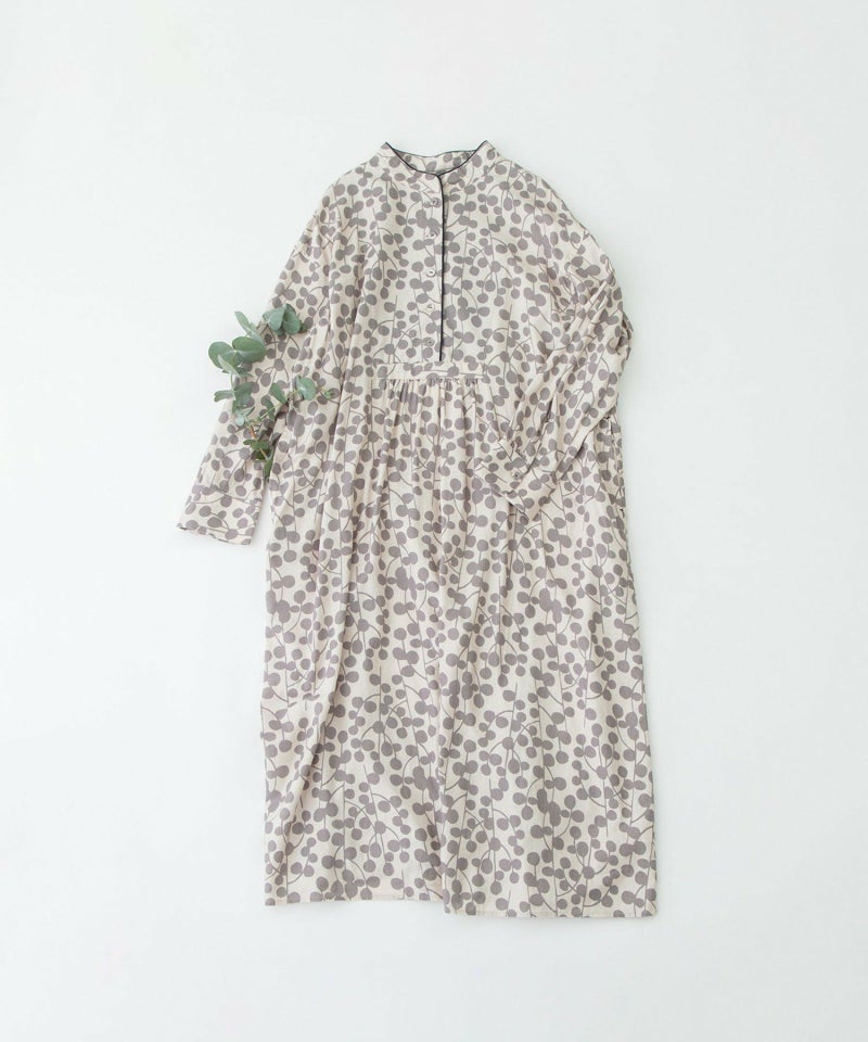 ユーカリモチーフを並べたドット柄の様なオリジナルプリント生地のワンピース。高めスタンドカラーがクラシカルで、すとんとしたシルエットです。素材はコットンビエラでふんわりと柔らかい手触りが特徴。衿と前あきには配色パイピングがアクセントに。両サイドのポケット口にはスカラップステッチが入っています。