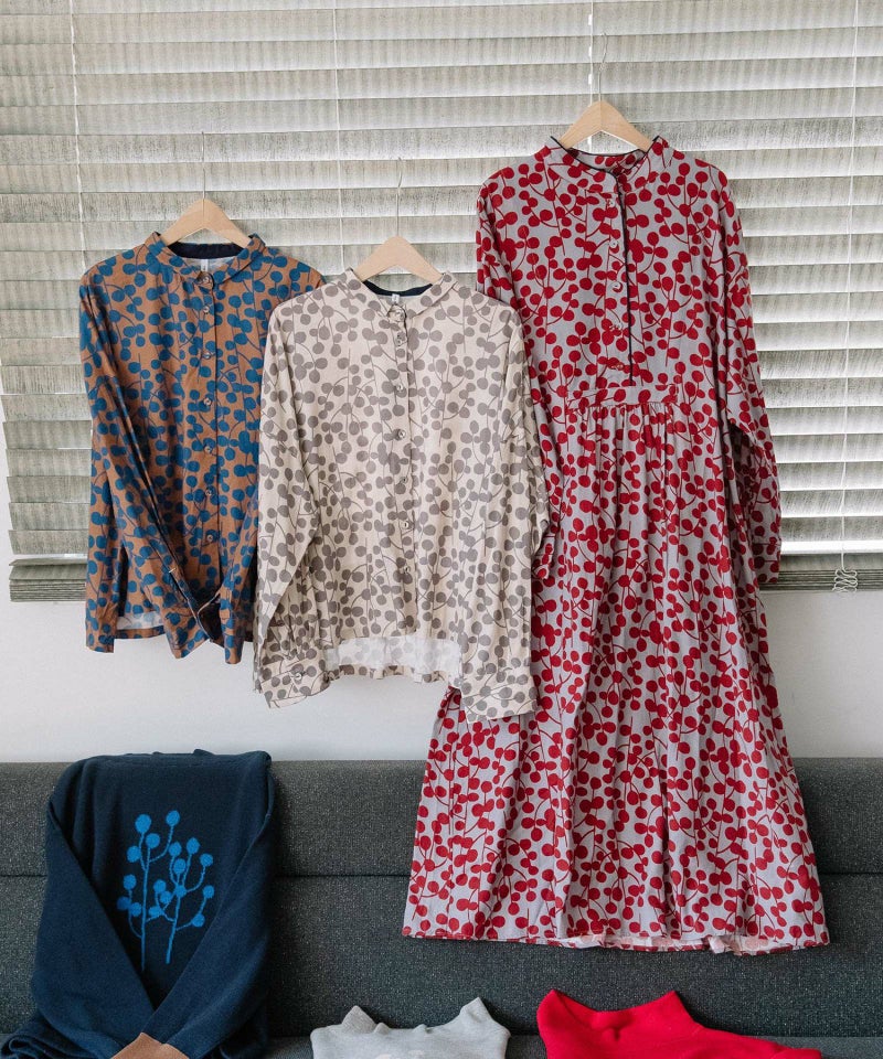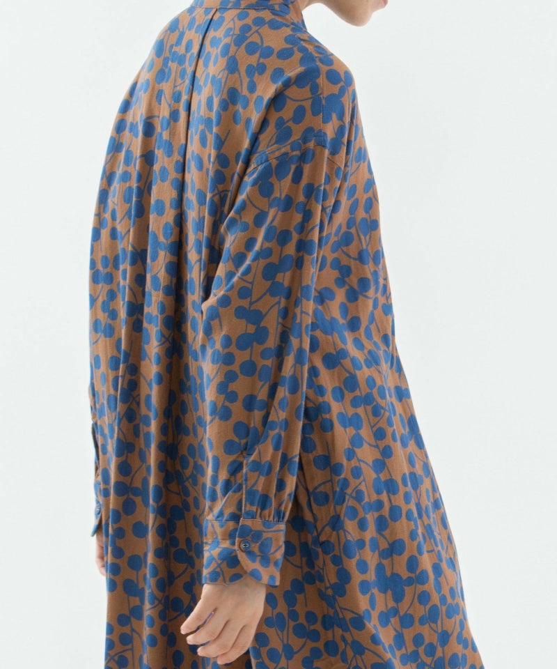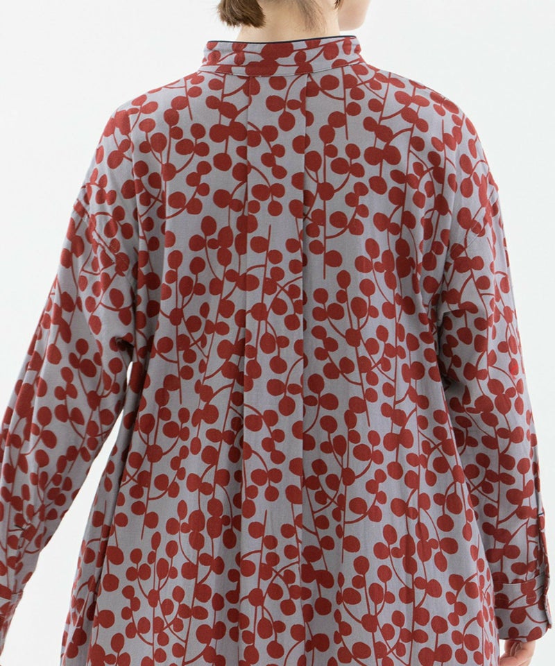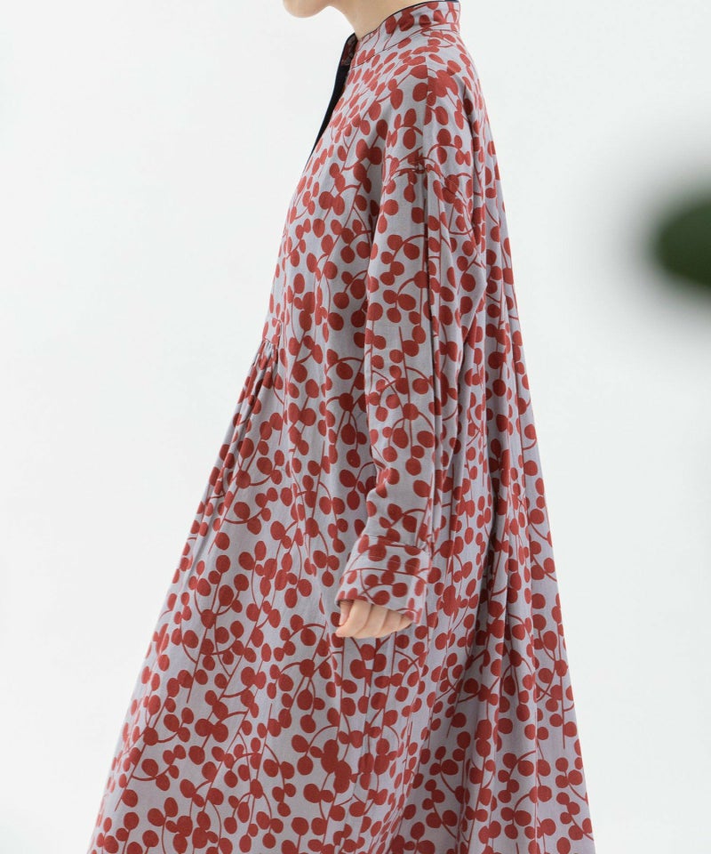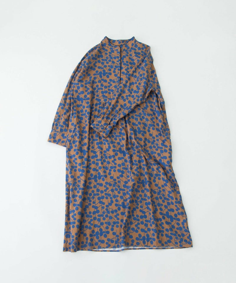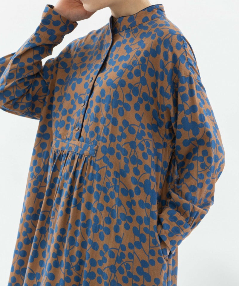 ユーカリモチーフを並べたドット柄の様なオリジナルプリント生地のワンピース。高めスタンドカラーがクラシカルで、すとんとしたシルエットです。素材はコットンビエラでふんわりと柔らかい手触りが特徴。衿と前あきには配色パイピングがアクセントに。両サイドのポケット口にはスカラップステッチが入っています。