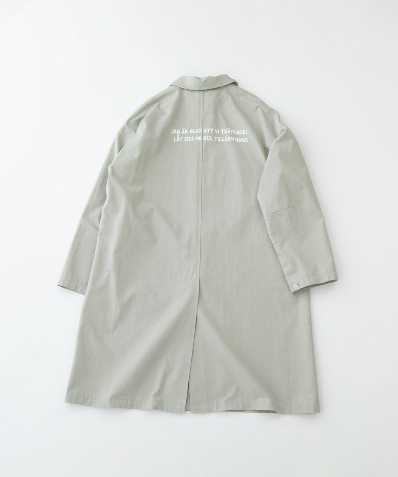 バックロゴプリント入りのさらりと羽織れるワークコート。春秋着られる厚すぎない軽めのコットンツイルを使用しています。前左ポケットにもプリントを入れてさりげないポイントに。ユニセックス対応で袖丈は長めです。内ポケットつき。