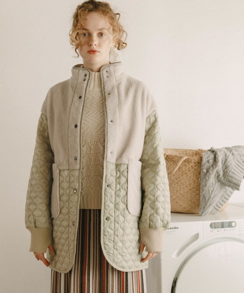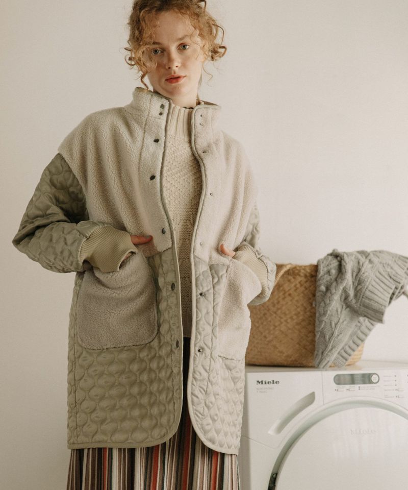 ・キルティングとボアを切り替えたコート。キルティングは一般的なへちま柄を小さくして並べたオリジナルの生地です。