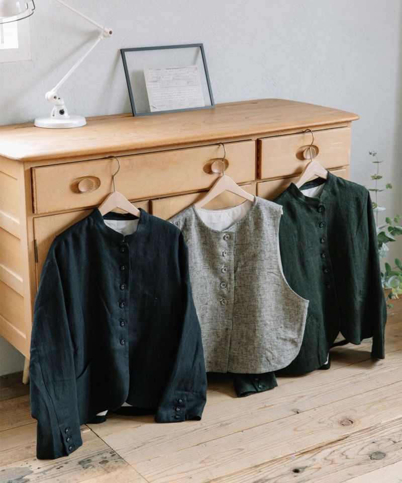 ・細かく並んだリネンくるみボタンや、斜めのボタンホールなどのディティールが制服のようにかちっと引き締めています。