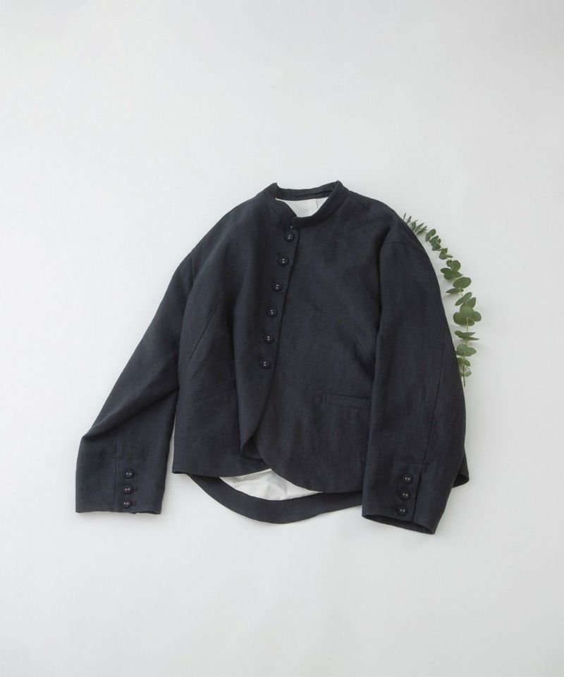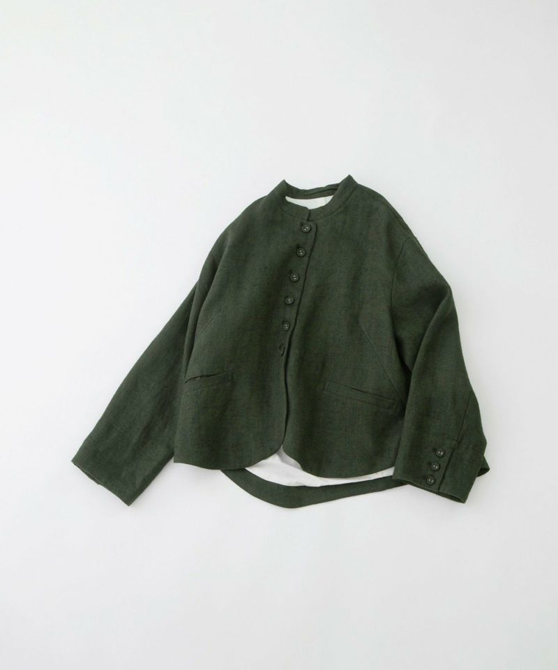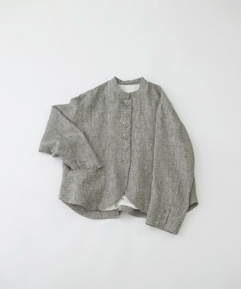 ・温かみがありツイード見えする麻100%のリネンビエラ起毛シリーズ。きちんとしたバンドカラーのカジュアルジャケットですが、ワーク調のラフな雰囲気です。