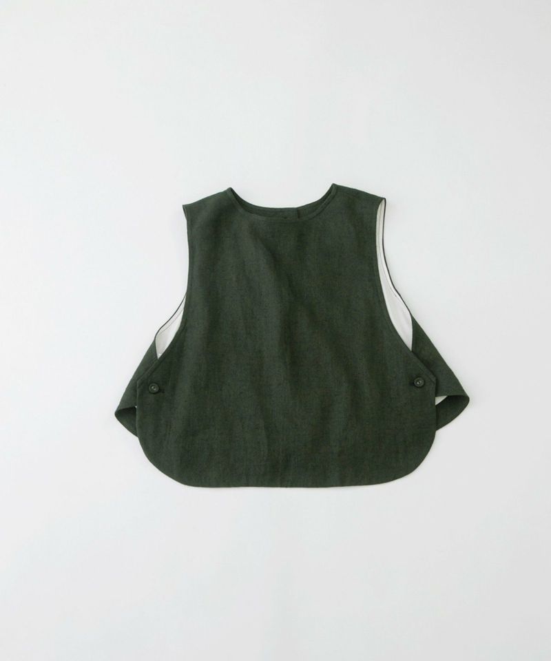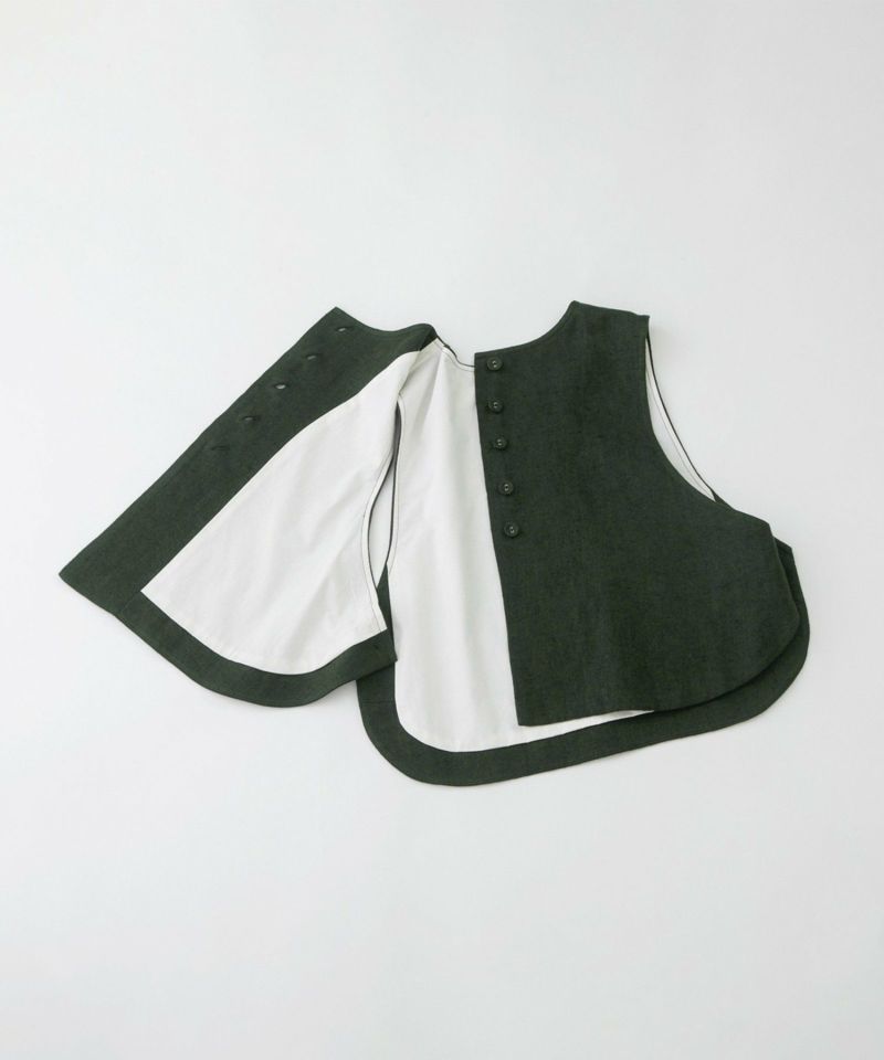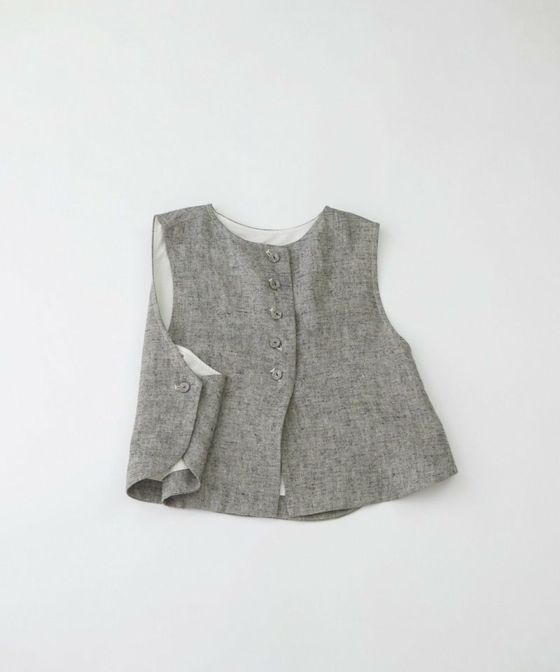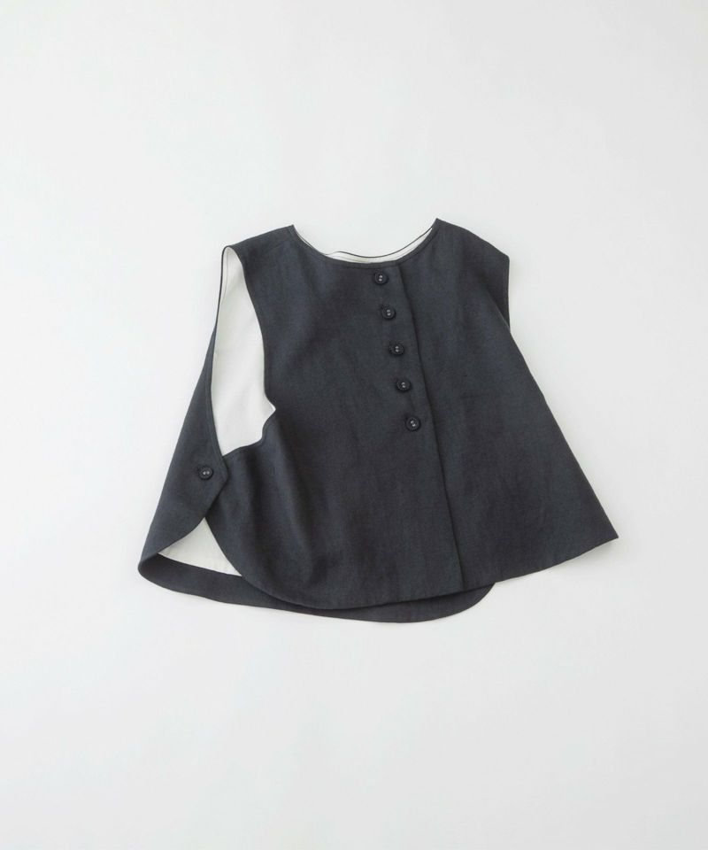 ・ラウンドした裾ラインにサイドはボタン留めで、広めにとったアームホールは袖にボリュームがあるインナーも合わせやすくなっています。