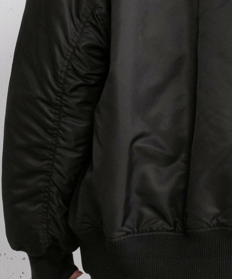 ヴィンテージのフライトジャケットを参考にしたオーバーサイズのMA-1ブルゾン。高密度に織られたツイル素材を使用しています。控え目な光沢感があり、深みのある色合いです。思いっきりカジュアルにスタイリングをするのが今の気分。少し高めにした衿や袖口のリブ切り替えが程よいフィット感。防寒性もあります。少し斜めにつけたアイコニックな立体ポケットは、下側にループをつけているので、キーチャームなどをつけられます。ポイントの配色裏地はダイヤ柄に丸いお花をプラスしたオリジナルのキルティング柄です。