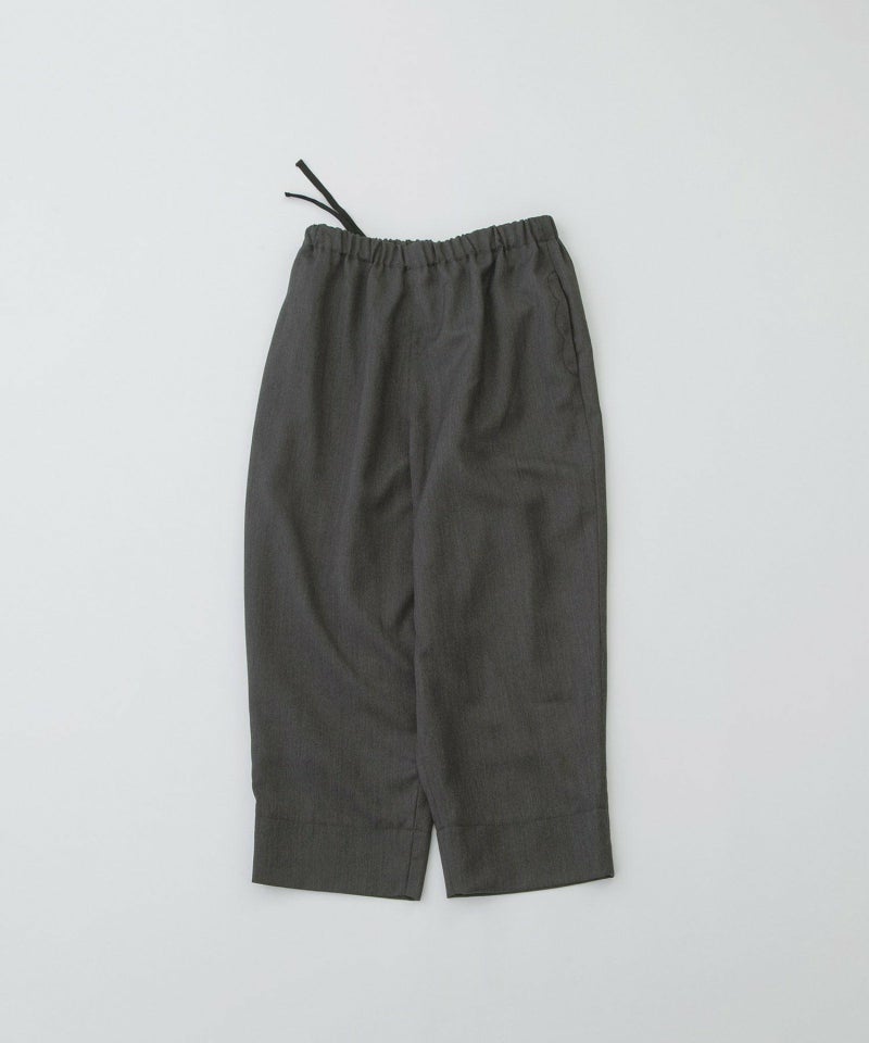 股上が深くリラックスしたゆるさと高い位置のボリュームがバランス良く決まるPommeパンツ。スーツや制服、ウインドブレーカーなどに用いられるギャバを使用。ウエストはゴム仕様で、内紐つき。両サイドのポケット口にはスカラップステッチがあり、さりげないアクセントに。■Styling