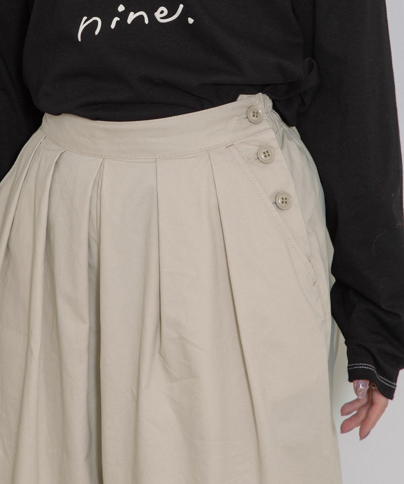 ・後ろのみゴムにしたことでウエスト周りはすっきりと。左脇のボタンあきもデザインのアクセント。両サイドにポケットあり。