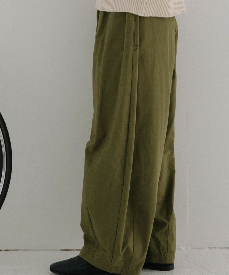 ・たっぷり入れたウエストのギャザーと裾のタックで理想的なまあるいシルエットのパンツを作りました。軽めで通年履けるコットンの綾ダンプを使用しています。