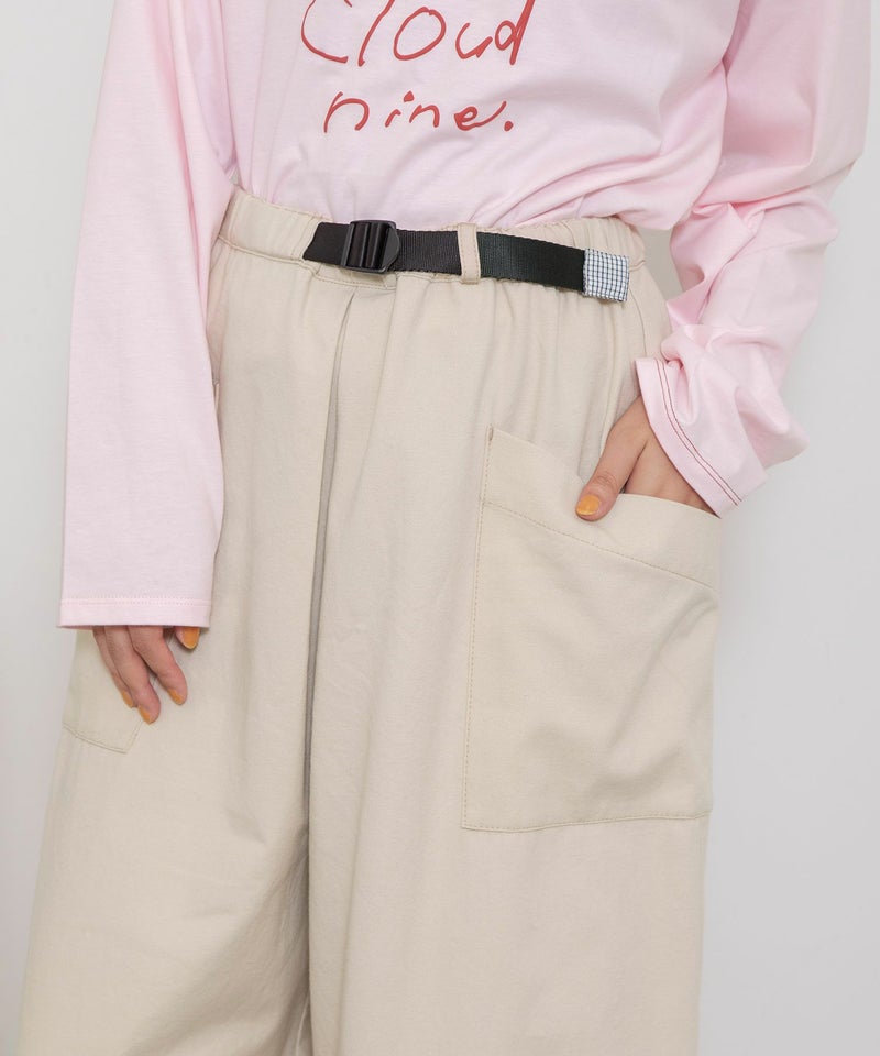 ・フロントに深く取ったタックがポイント。ウエストはぐるりゴムで履きやすく、フロントのプラバックルのベルトはトップスをインした時のアクセントになります。
