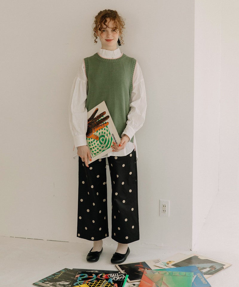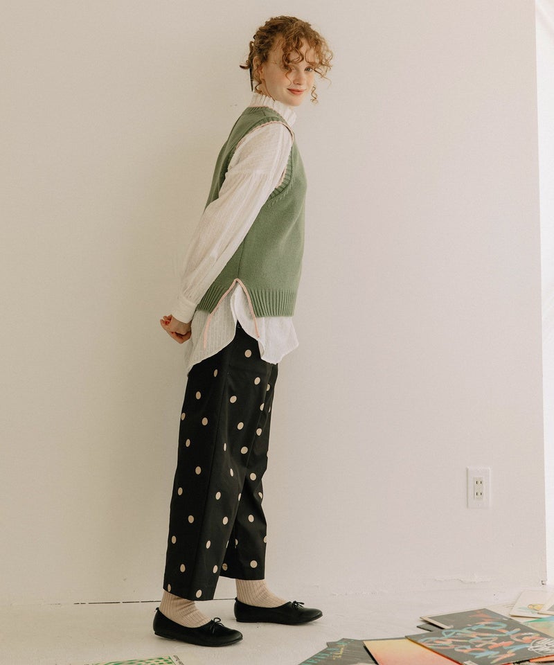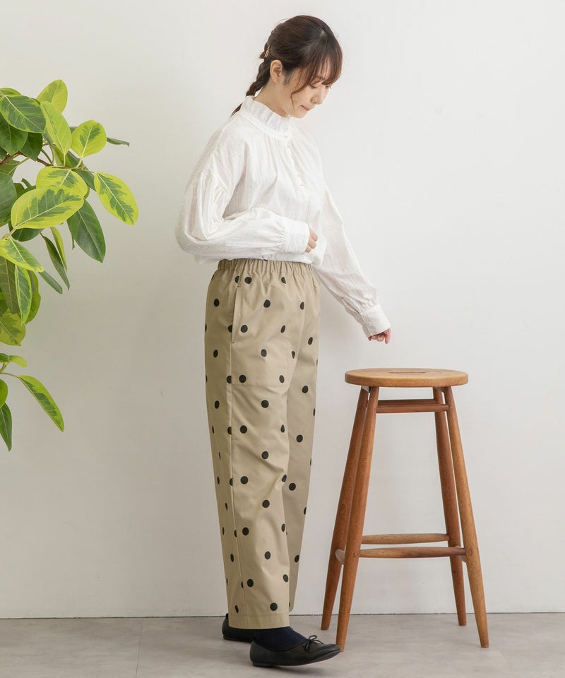 ・シワになりにくく、ハリ感のあるポリエステルツイル生地を使用した程よい大きさのドットパンツ。すっきりとした履きやすさが人気のシルエットです。