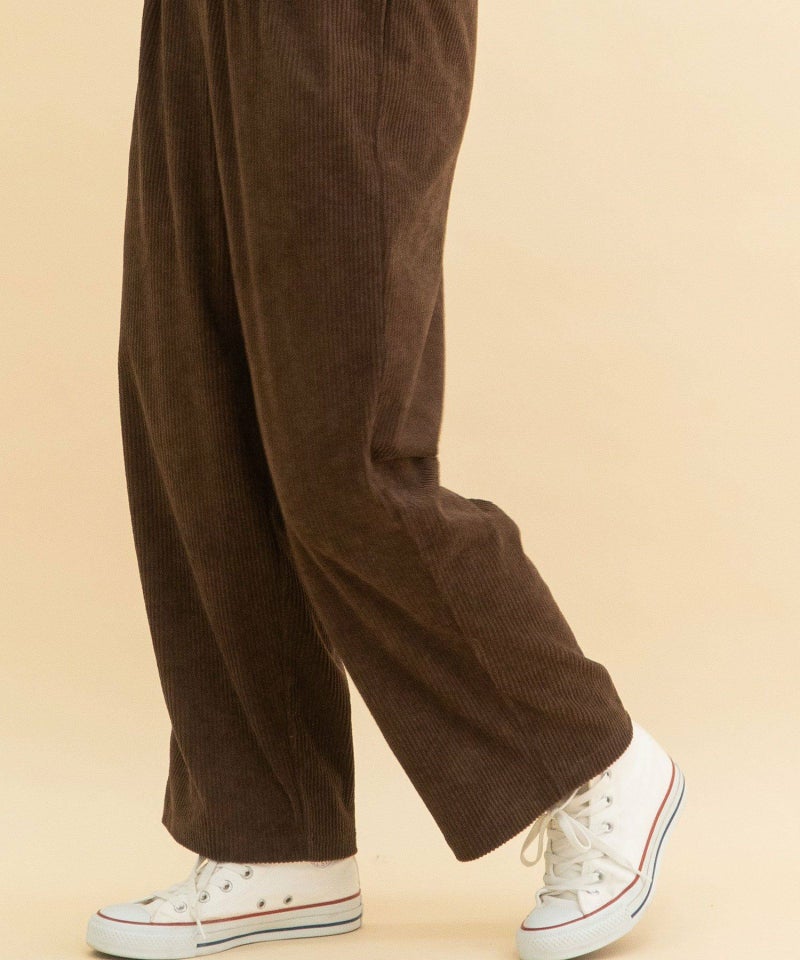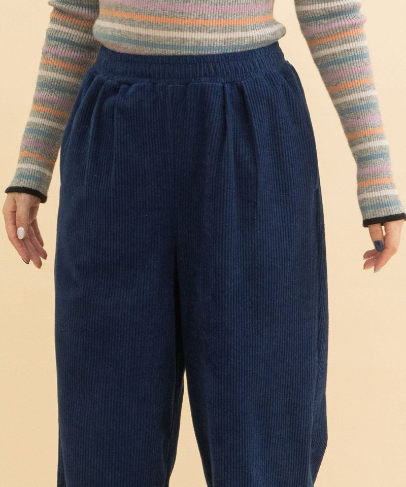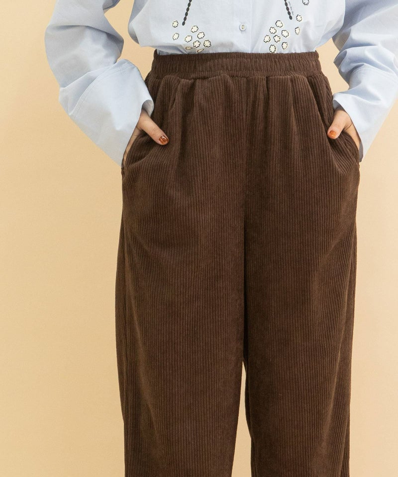 暖かみのある、なめらかな肌触りのコーデュロイ素材を使用したパンツ。伸縮性のある素材とウエストゴム仕様で楽な履き心地です。使い勝手の良いシンプルなストレートシルエット。ウエスト紐で調整が可能、両サイドポケットつき。