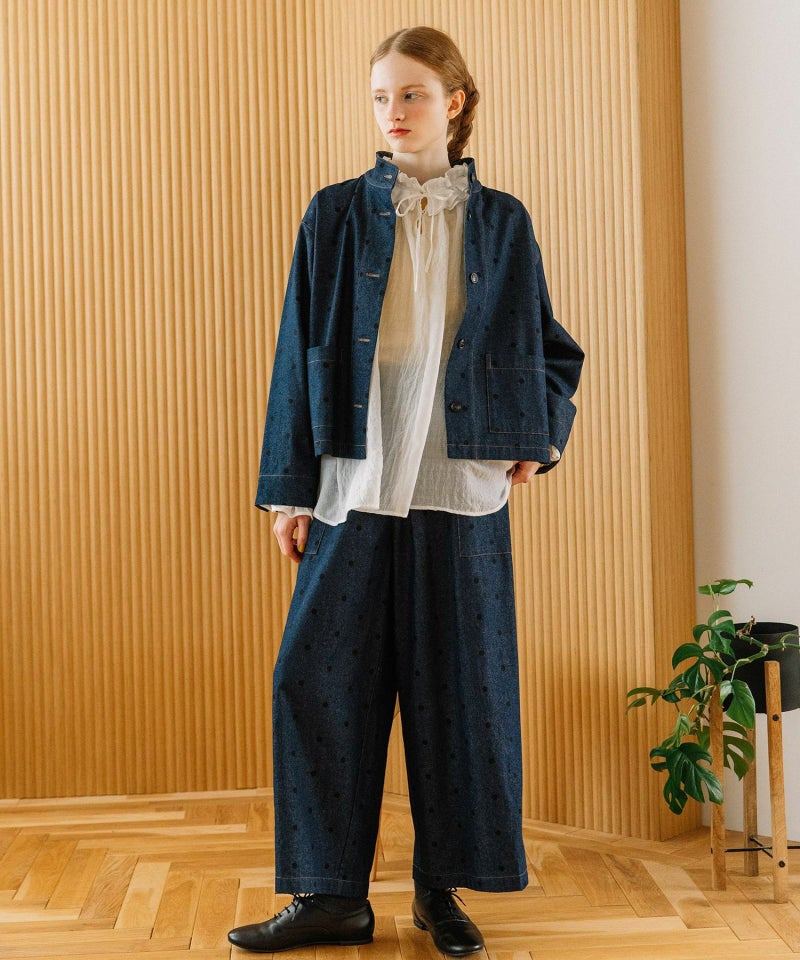 イージーシルエットが魅力のワイドパンツ。フロントのタックと両サイドの大きなポケットがポイントです。前中心のベルトはすっきりと、脇から後身にはゴムを通しています。ボリュームのあるボトムなので、トップスはタイトにするとバランスを取りやすいです。あえてビックサイズのカットソーと合わせてリラクシーな雰囲気を出すのもおすすめ。ブラックドットをプリントしたワンウォッシュデニムとコットンツイルのブラック無地の展開です。