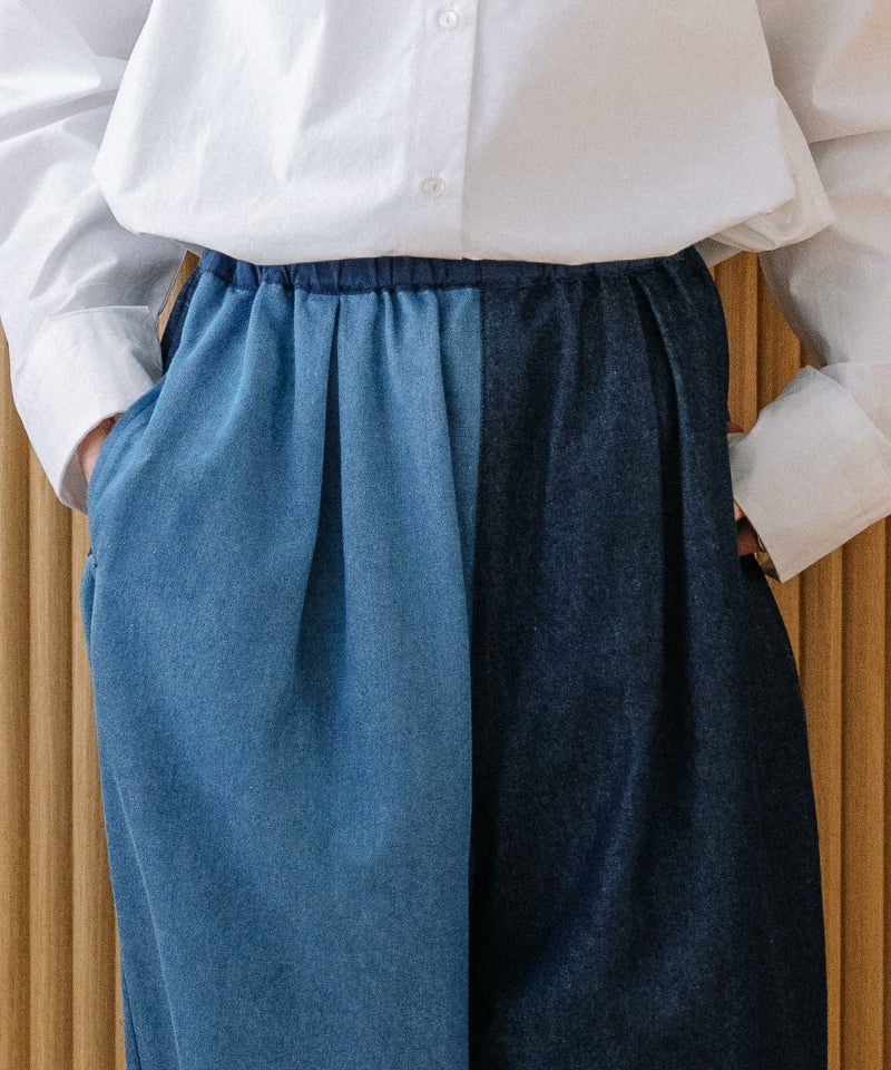 カラーブロックが目を惹くデザインパンツ。ウエストタックでヒップラインに丸みをもたせつつ、 裾にかけてやや絞ったシルエット。切り替えを入れて3色を掛け合わせた個性的な表情で、カジュアルな雰囲気も楽しめるアイテムです。ウエストはゴムのイージー仕様。両サイドにポケット付き。
