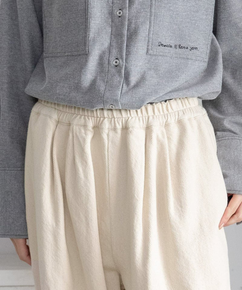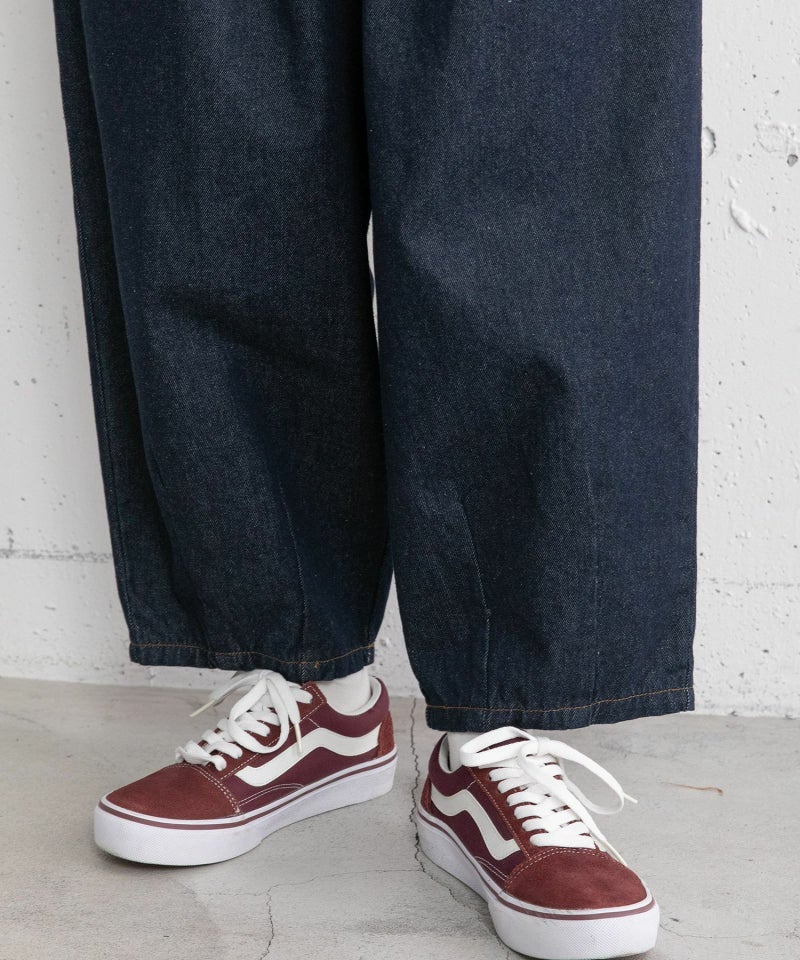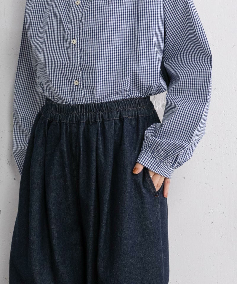オールシーズン着まわせるほどよい厚さのデニムとふんわり甘めに織り上げたツイル素材のアソート展開で仕立てました。左右にタックを取った丸みのあるシルエットが特徴的なカーブパンツです。ヒップまわりにゆとりを持たせつつ、裾はダーツを取ってすっきりと仕上げました。ウエストはぐるりとゴムを入れ、紐つきでサイズ感の調節も可能です。シンプルでデイリーユースにぴったりな一本です。配色ステッチでカジュアルに仕上げています。両サイドポケットつき。