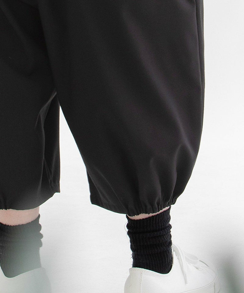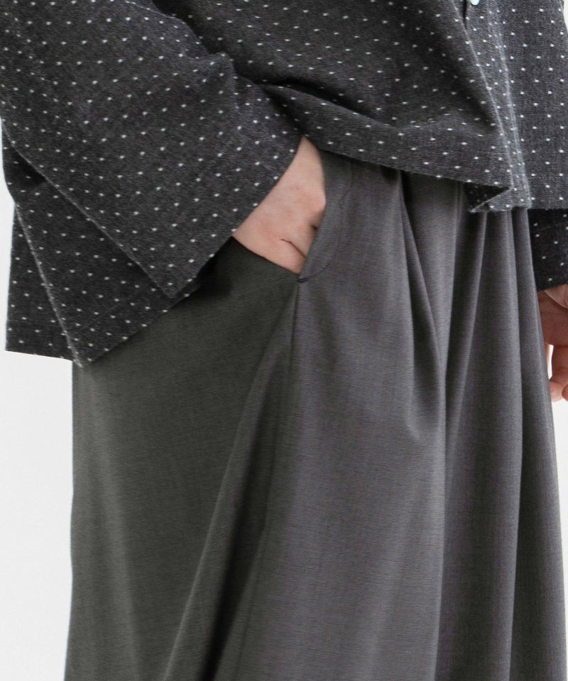 大きく膨らんだ8分丈バルーンパンツ。秋や春の端境の季節のきちんとしたい時期に重宝するフォーマル生地の「トロピカル」で仕立てました。ポリエステルレーヨンで、しわになりにくくイージーケアがうれしいシリーズです。脇が丸くなるように裾は脇だけゴムでギャザーを寄せています。ほっこりしたシルエットと、きちんと感のあるフォーマル素材の組み合わせがモードなアイテム。ウエストはゴム仕様でリラクシーな履き心地。両サイドポケットにはスカラップステッチを入れてさりげないアクセントを効かせています。
