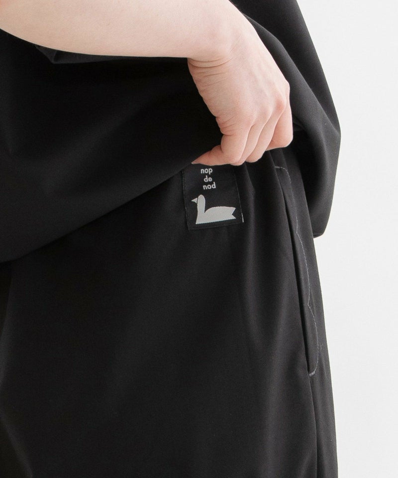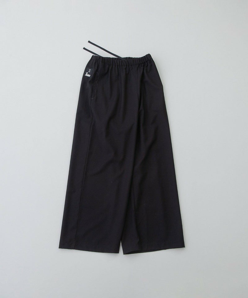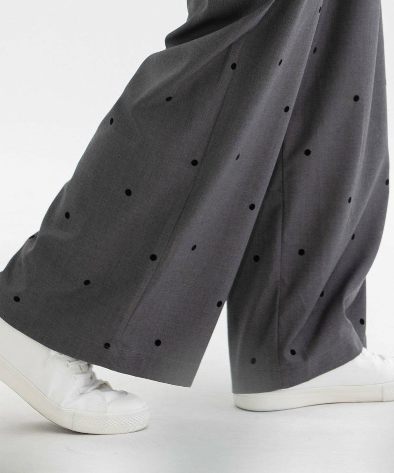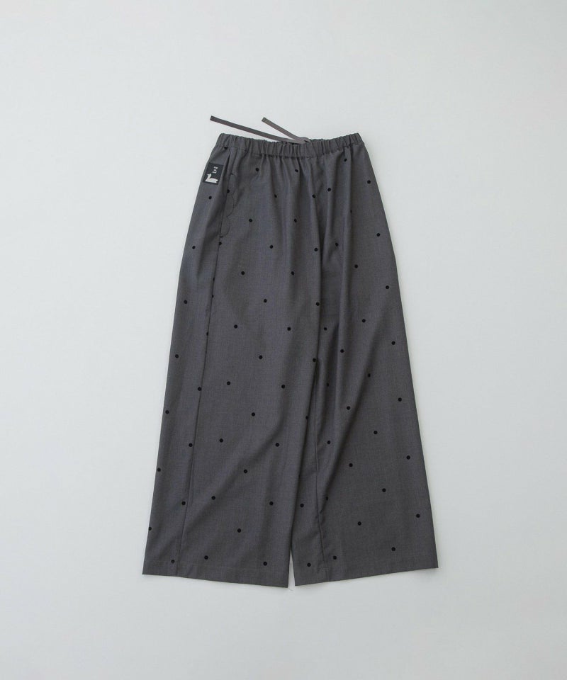 リラックスしたシルエットのラフに履けるイージーワイドパンツ。秋や春の端境の季節のきちんとしたい時期に重宝するフォーマル生地の「トロピカル」で仕立てました。ポリエステルレーヨンで、しわになりにくくイージーケアがうれしいシリーズです。フロッキーのドットプリントとブラックの2色展開。シンプルなトップスでもモードに決まるボトムです。ウエストはゴム仕様、両サイドポケットのスカラップステッチや、右後ろのスワンネームがさりげないアクセントを効かせています。