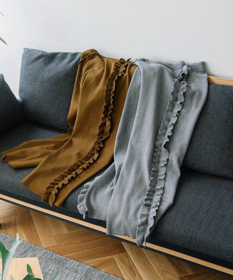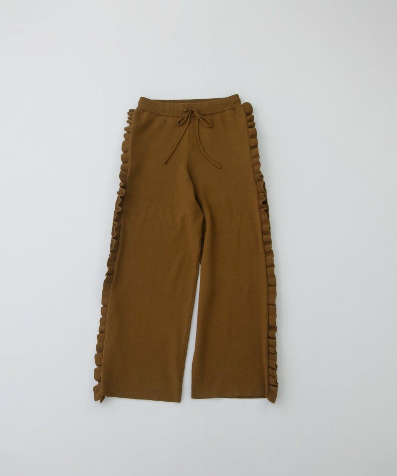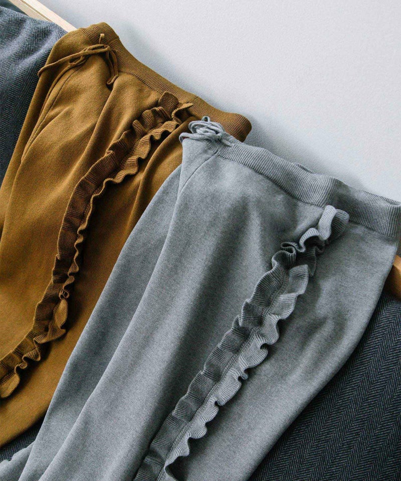 12ゲージ総針編みで仕立てた、レーヨンポリエステル素材のパンツ。毛玉になりにくく、お手入れが簡単な通年アイテムです。すとんと落ちるストレートラインのフルレングス。脇にあしらったニットフリルがアクセント。ウエストはゴム仕様でリラックスして履いて頂けます。編み機すべての針を使った総針編みは、手間と糸を惜しまず使用しているため、しっかりとしたハリ感と上品な目の詰まりが特徴。光沢のあるレーヨン糸にポリエステル糸を添えてプレーティングすることで、美しい表情と型崩れしにくい仕上がりになっています。