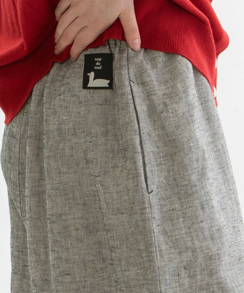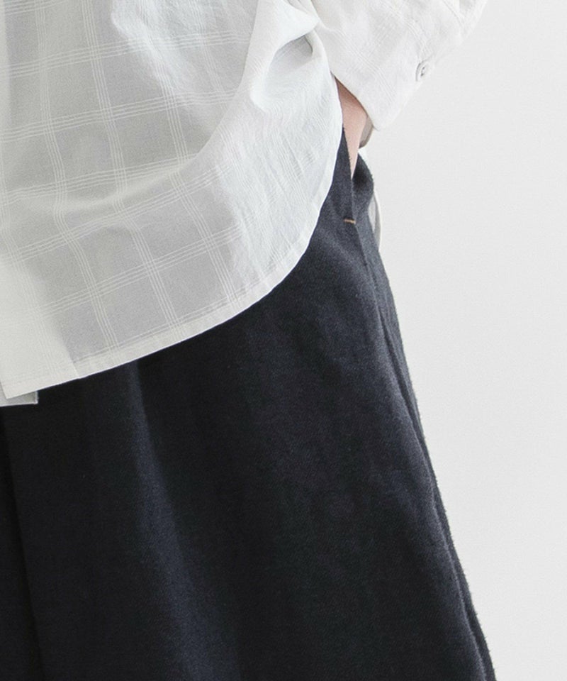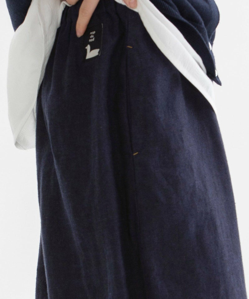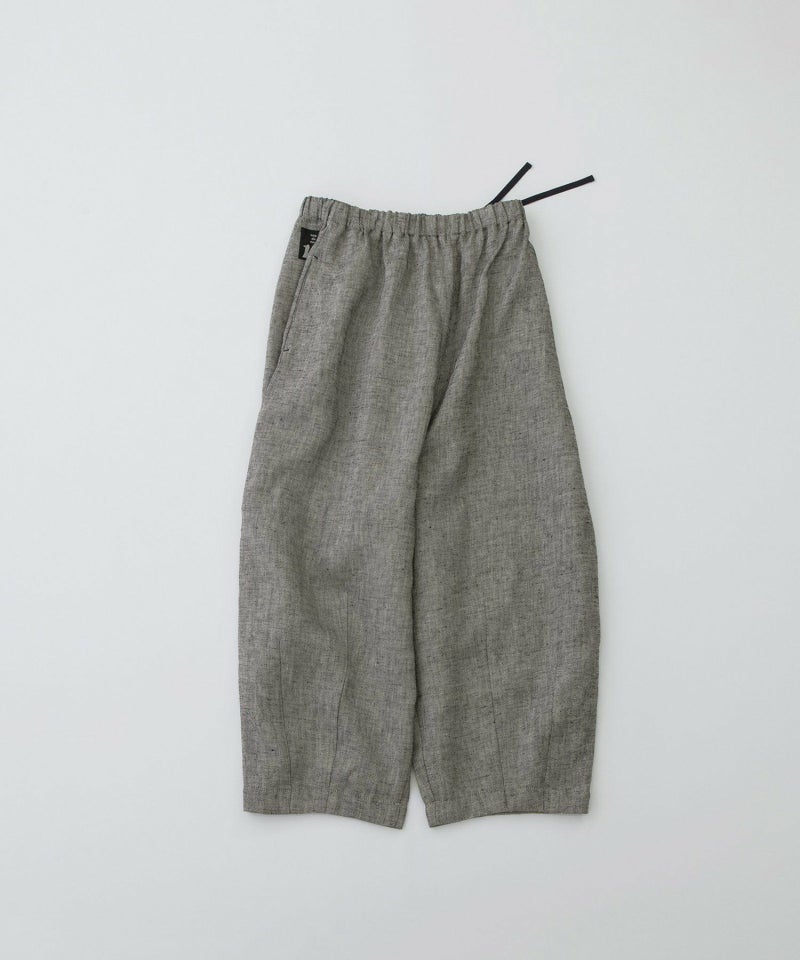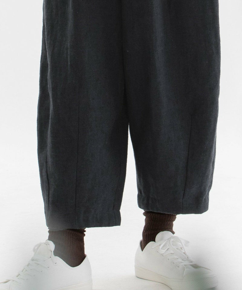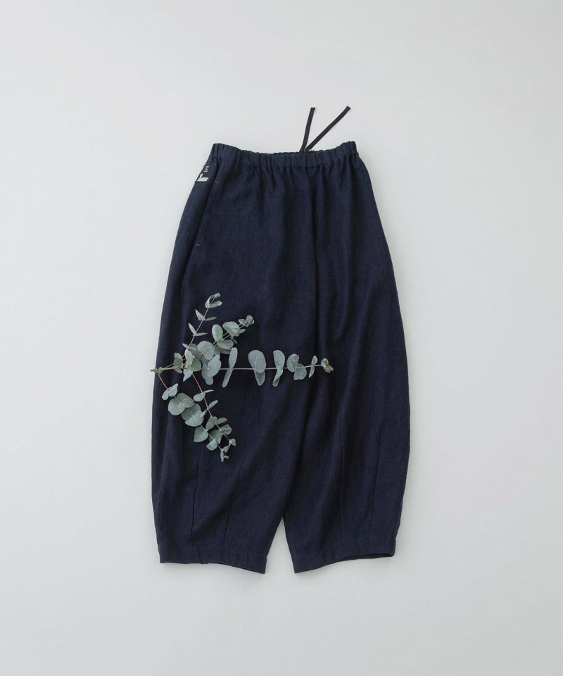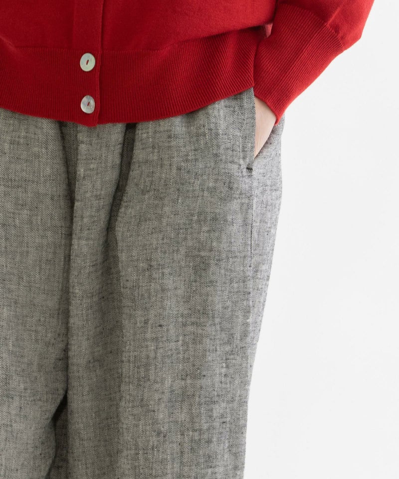 暖かみのある素材のきれいなテーパードラインの9分パンツ。股上が深くリラックスしたゆるさがありながら、高い位置にボリューム感を持たせているのでバランス良く着こなせます。ツイード見えする麻100%のリネンビエラ起毛を使用。ウエストはゴム仕様で、内紐つき。右後ろのスワンネームやサイドの配色三角ステッチ、両サイドポケットのスカラップステッチなどもさりげないアクセントを効かせています。